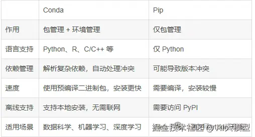 Conda 是一个开源的包管理和环境管理系统,最初由 Anaconda 公司开发,主要用于 Python 及其他语言(如 R、Ruby、Lua、Perl、Haskell、C/C++)的包管理和环境管理。它可以安装、更新、卸载软件包,并创建隔离的虚拟环境,使得不同项目之间的依赖不会相互干扰。Conda与pip的区别: