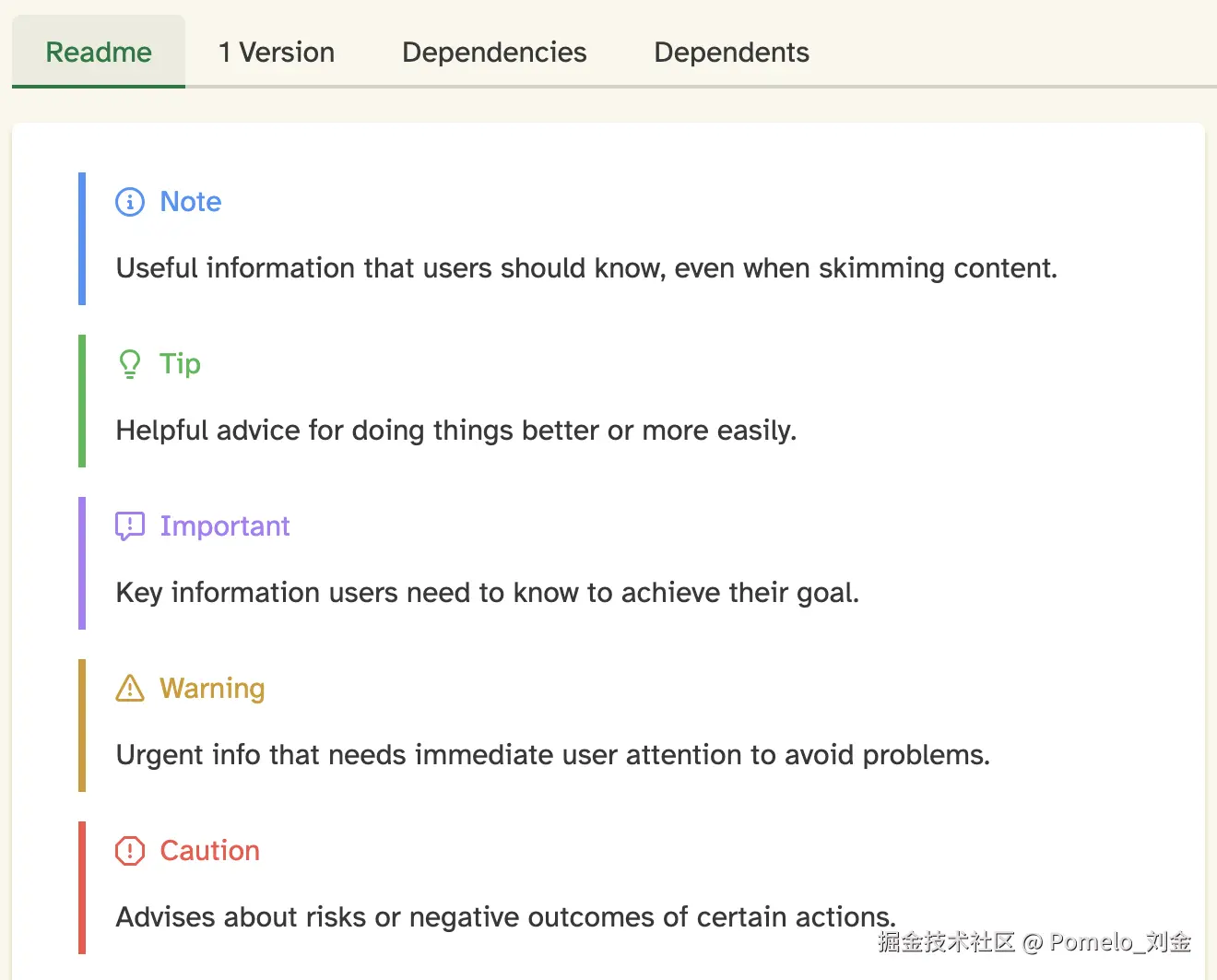 - 场景:在 README 里加"重要提示/注意/警告"更显眼,省去自定义 HTML/CSS 的麻烦。
