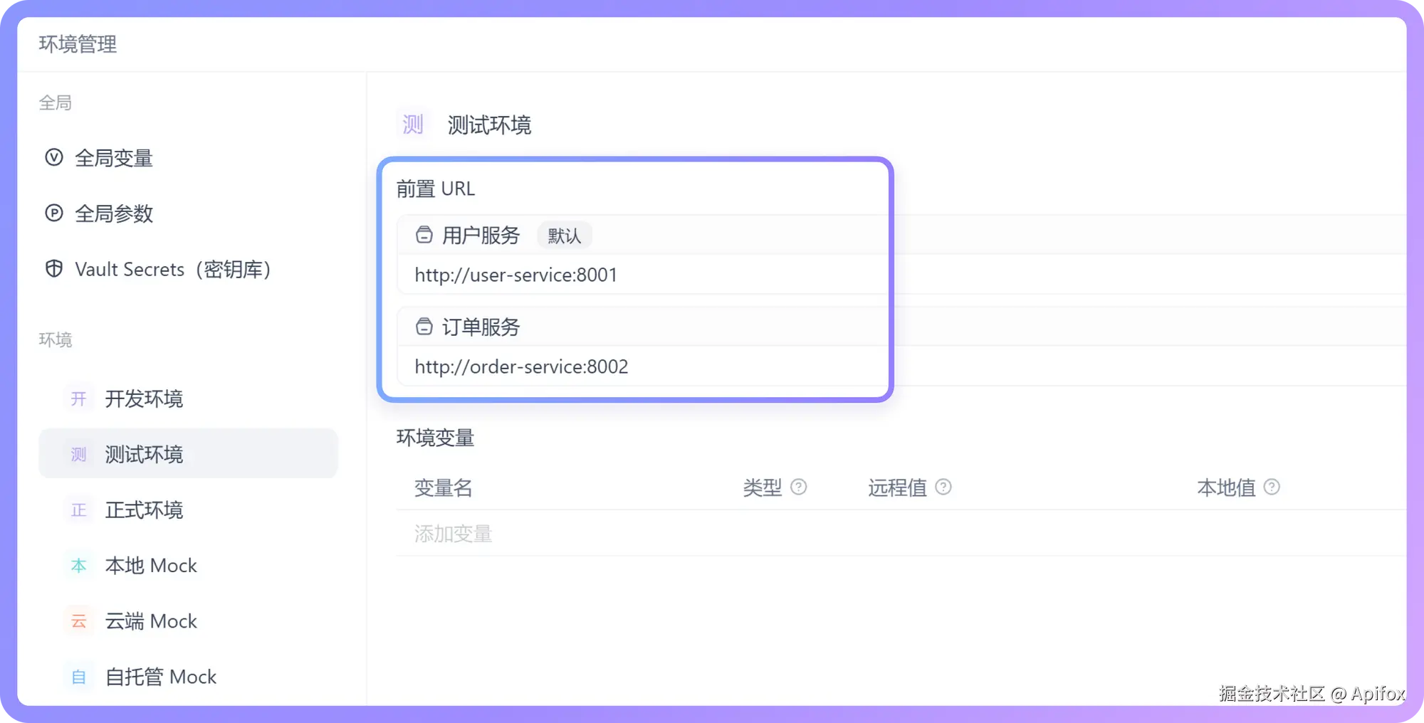 在环境设置中,每个模块的"前置 URL"可单独配置。例如在测试环境中,用户服务模块的前置 URL 可以设置为 http://user-service:8001,订单服务模块则为 http://order-service:8002。