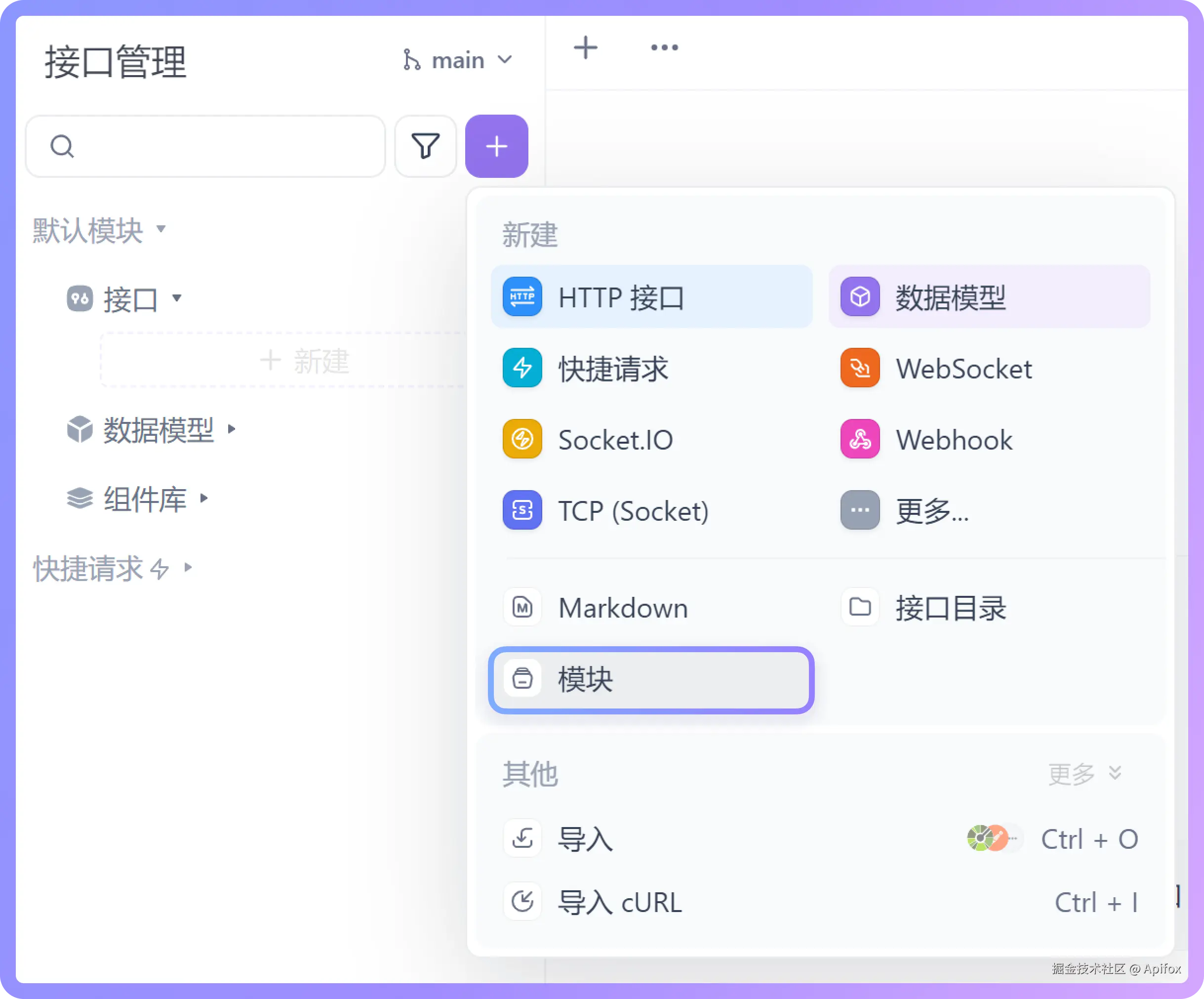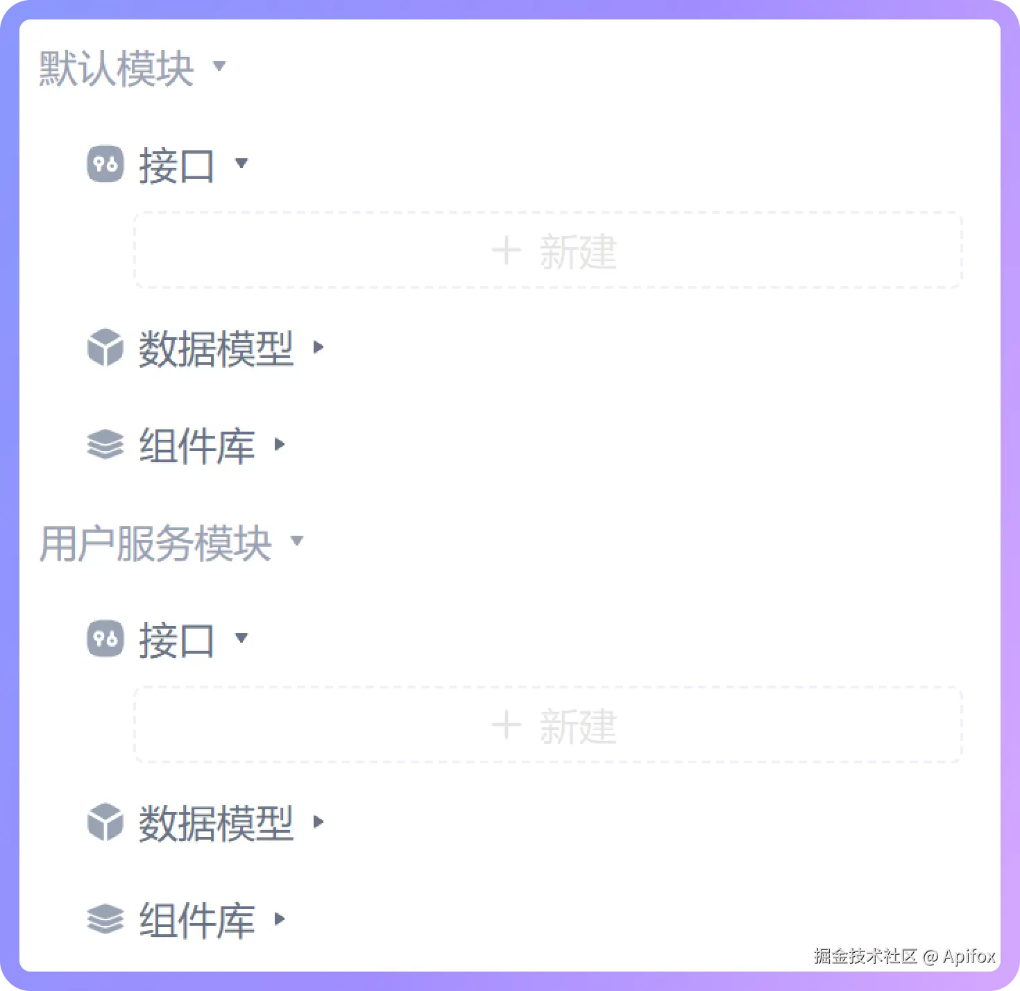 当你创建一个新项目时,Apifox 会自动为你创建一个"默认模块"。如果你的项目只包含一个后端服务或接口集合,默认模块通常就足够使用。但如果你需要管理多个不同的 API 服务,就可以为每个服务创建独立的模块。