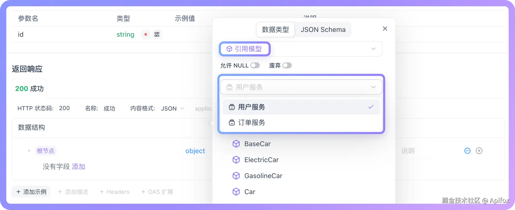例如,用户相关的数据模型可以定义在「用户服务」模块中,订单相关的模型则定义在「订单服务」模块中。当订单模块需要引用用户信息时,只需直接选择「用户服务」模块中的用户数据模型即可,无需重复创建。
