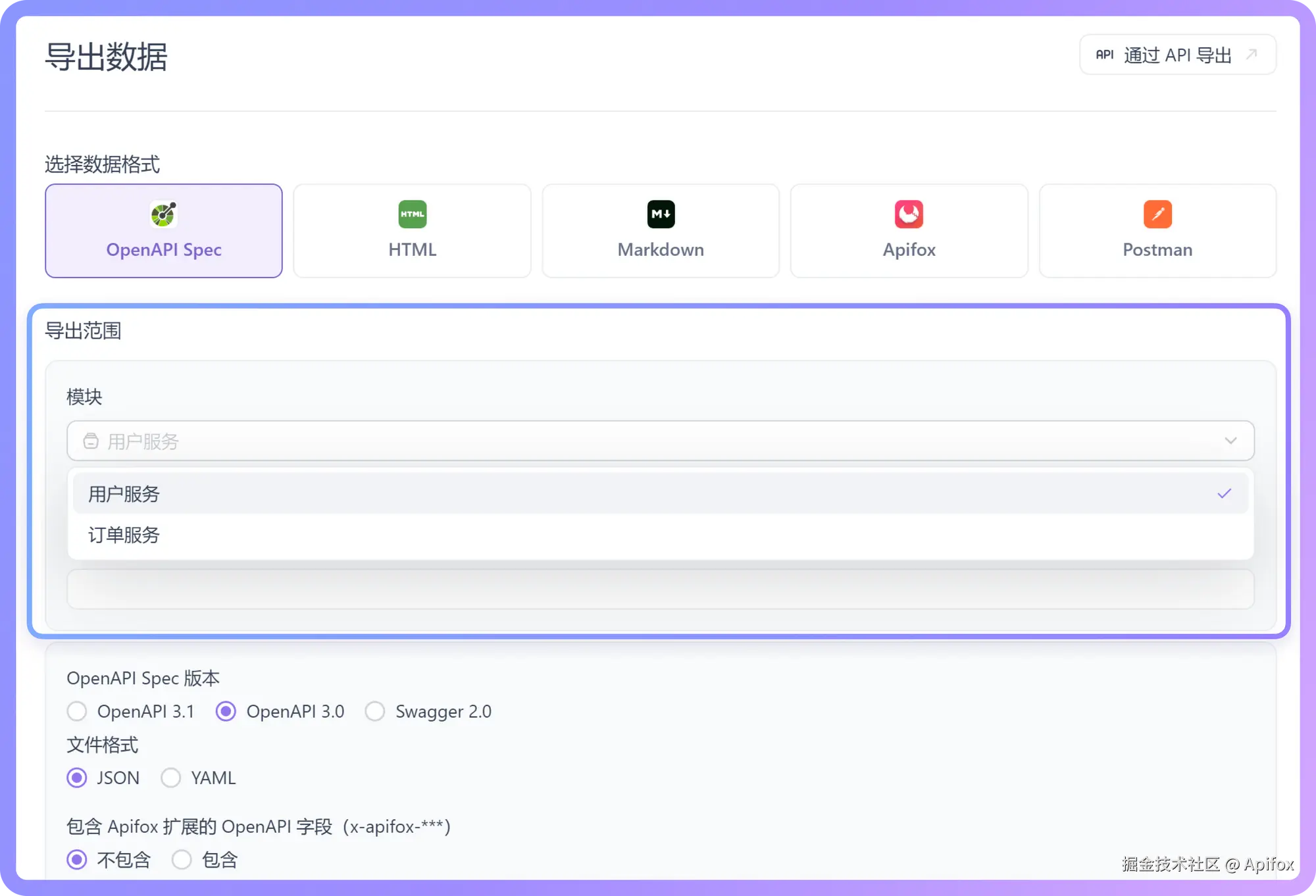 每个模块对应一份完整的 OpenAPI 规范文件,在导出 OpenAPI Spec 数据时,就可以看到是按"模块"分别导出的。