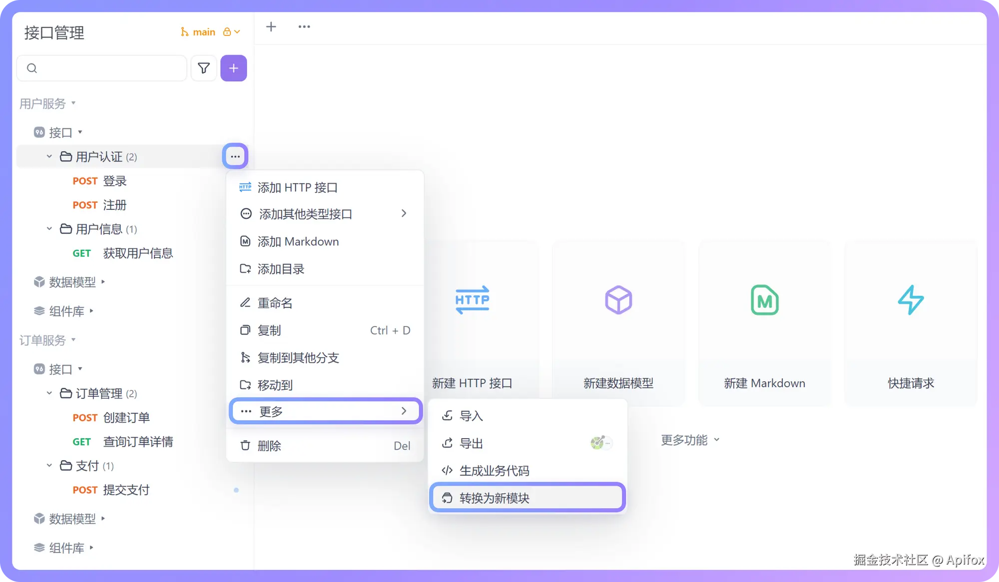 当发现某个目录下的接口数量过多、逻辑上应独立管理时,可以将该目录转换为模块。点击目录右侧的...,在菜单中选择「转换为新模块」即可。这个功能有助于在业务扩展或接口增多时,对项目结构进行更合理的重构。