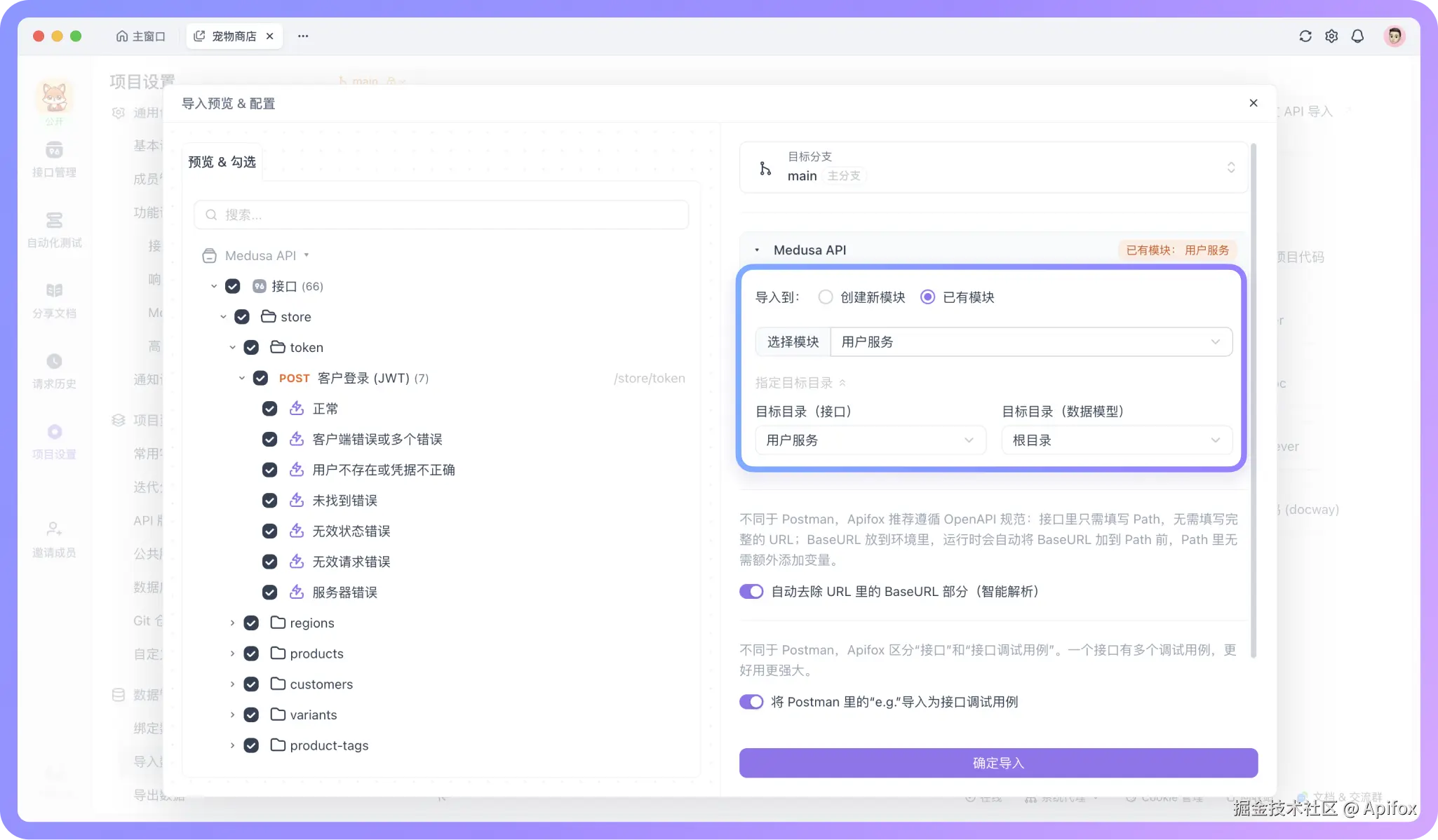 在导入时,每个 Postman Collection 会对应一个模块,文件夹结构会映射为目录。接口和数据模型的组织关系在 Apifox 中能够完整保留,这样既可以沿用原有的接口层级和分类,同时也可以继续在 Apifox 中按照模块、目录和数据模型管理接口。