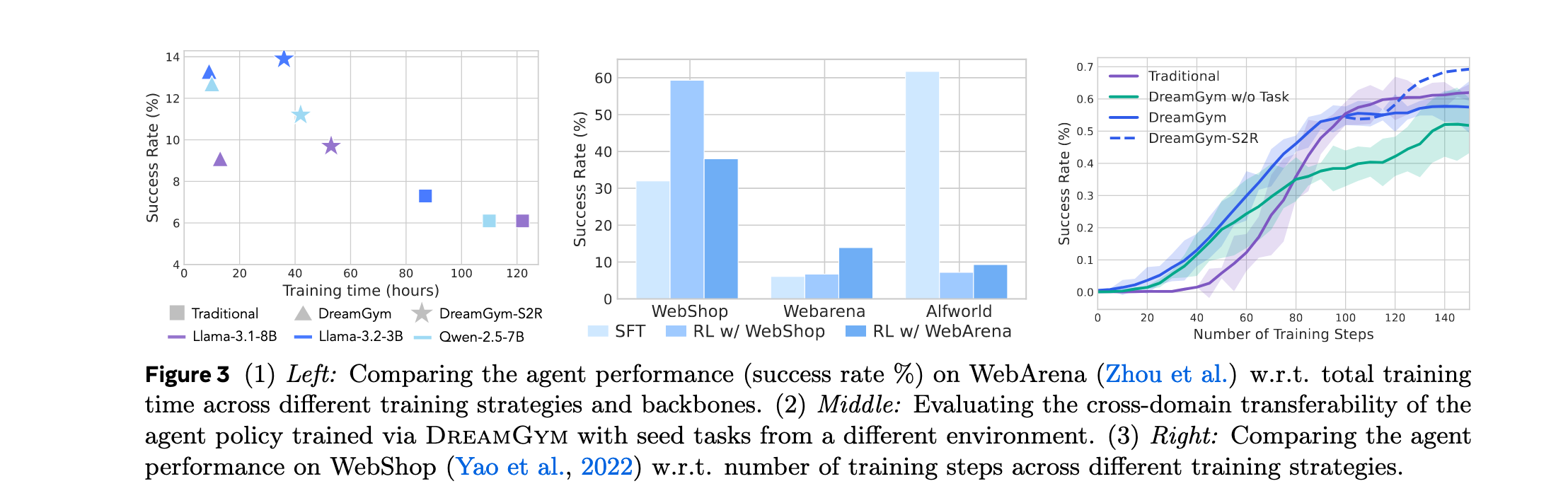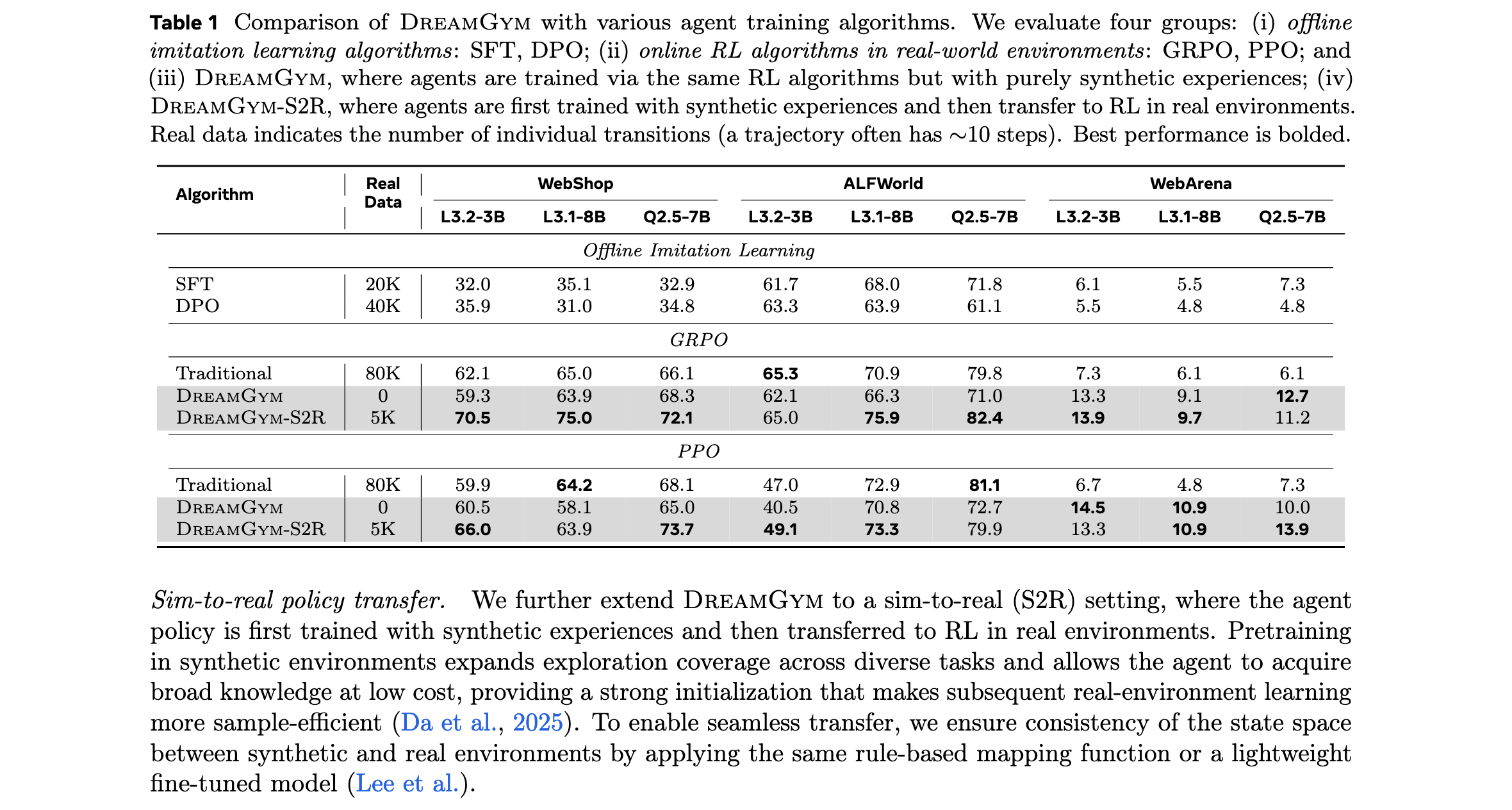 - 在多个环境和智能体骨干网络上验证,DreamGym在完全合成设置和仿真到真实迁移场景中显著改善RL训练