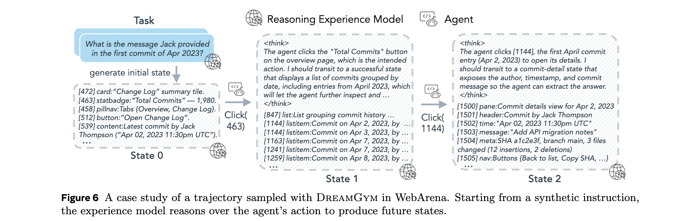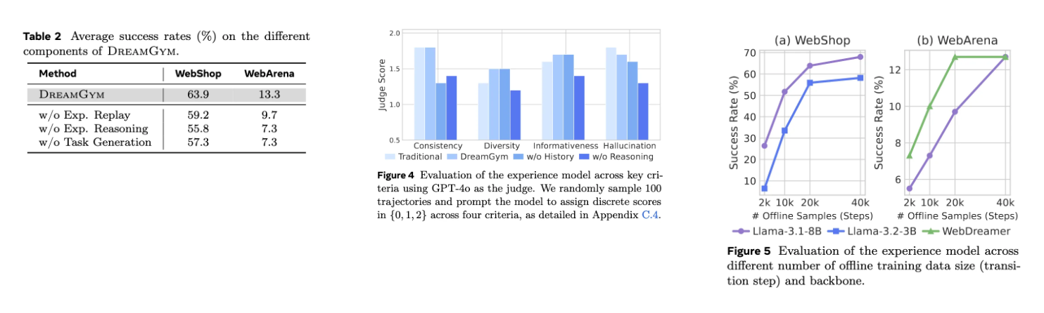 - 首创统一框架DreamGym,通过基于推理的经验模型合成多样化经验,实现可扩展的在线RL训练