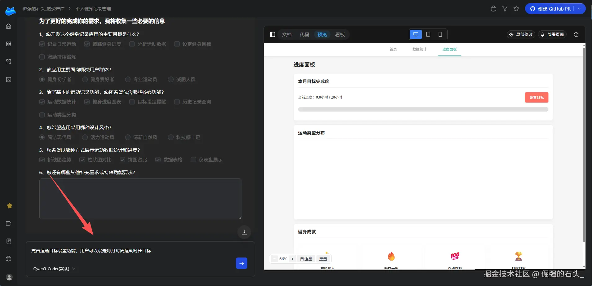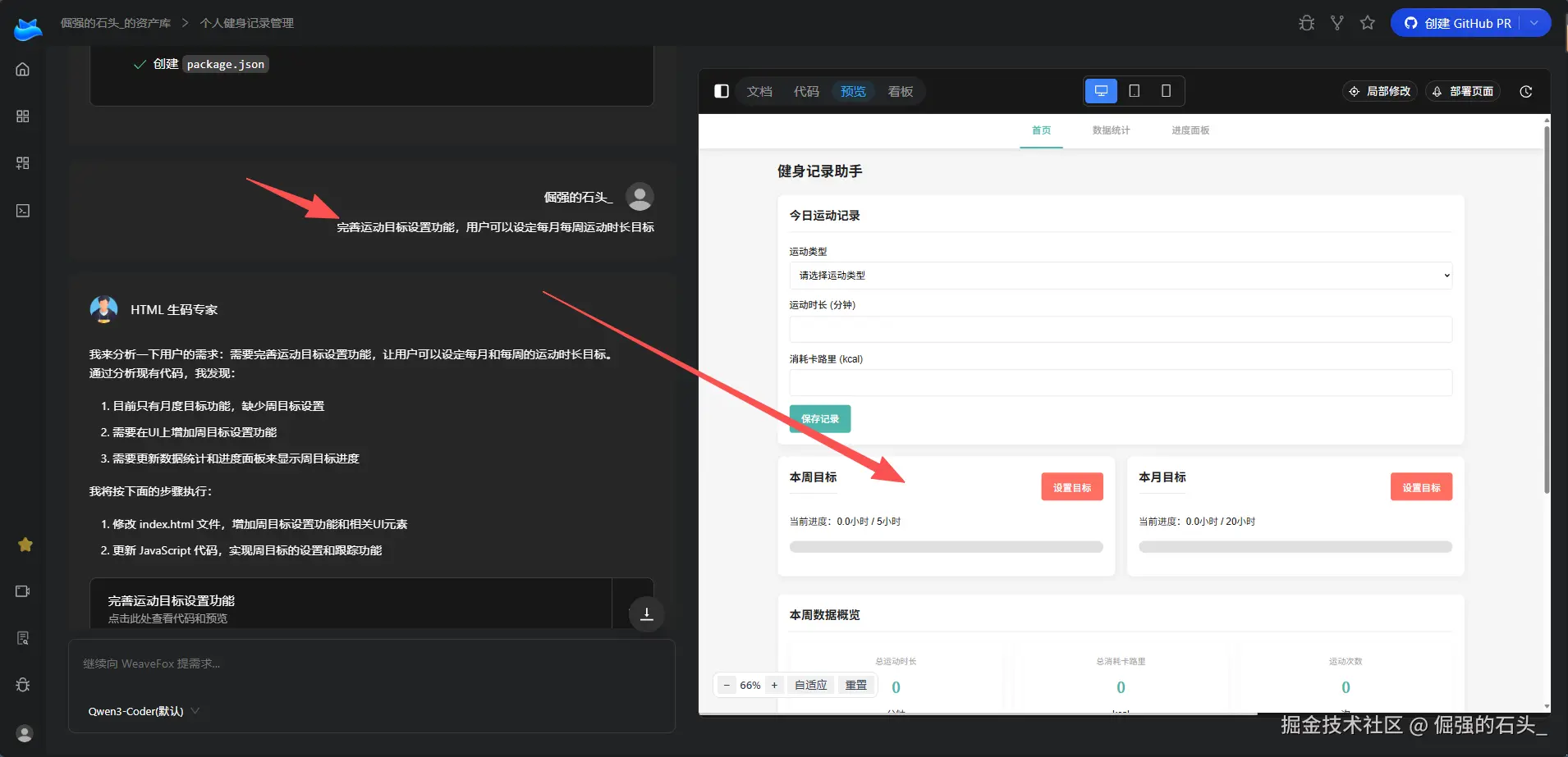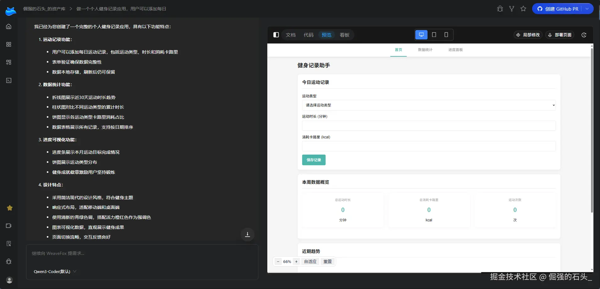 我用一句话描述需求:"做一个个人健身记录应用,用户可以添加每日运动记录,包括运动类型、时长、消耗卡路里,支持数据统计和进度可视化。"