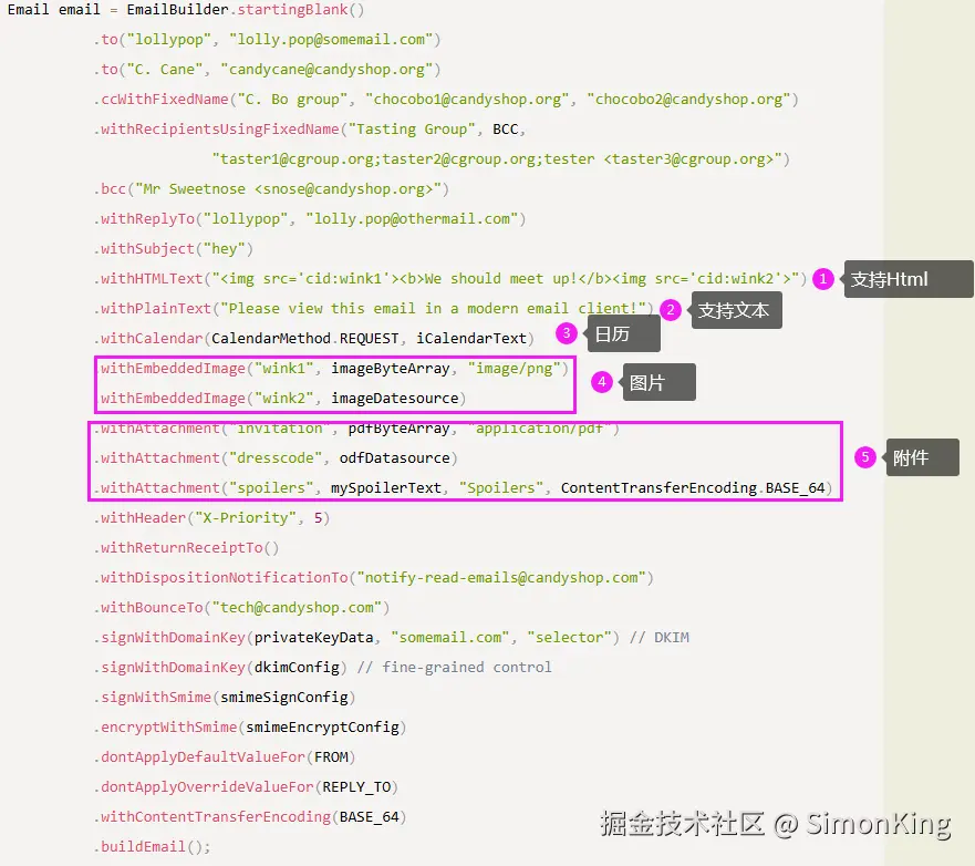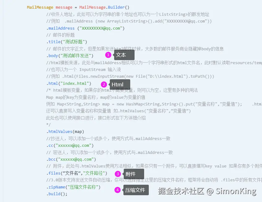 通过MailerBuilder构建发送的客户端,通过EmailBuilder构建发送邮件的具体信息。