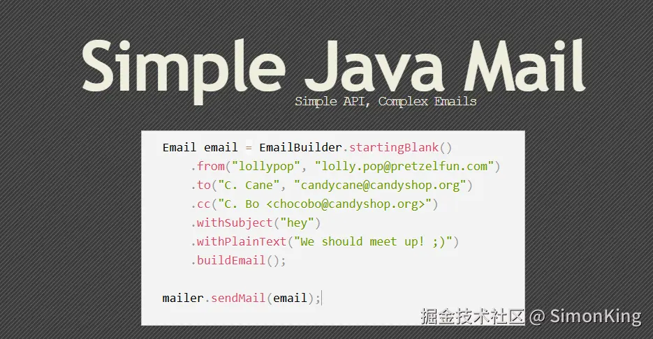 Simple Java Mail 是一个拥有超简洁 API 的邮件库。它是世界上使用起来最简便的(Java)邮件库,可通过 SMTP 发送电子邮件。这个库让你无需处理诸如MimeMessage之类的底层API、繁琐的trycatch结构、内部类以及其他无用的东西。它是一个功能强大、特性完备的邮件库,同时又小巧且轻量。