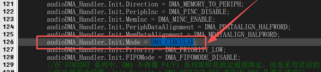 在DMA初始化配置里面我们还需注意下DMA模式要使用循环模式: