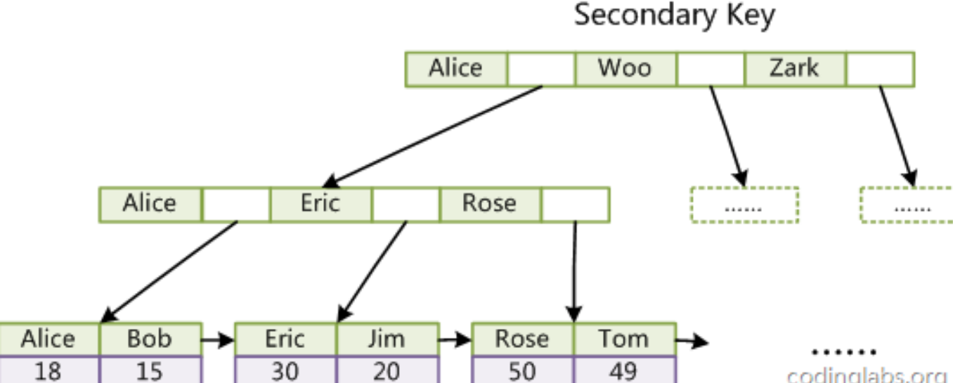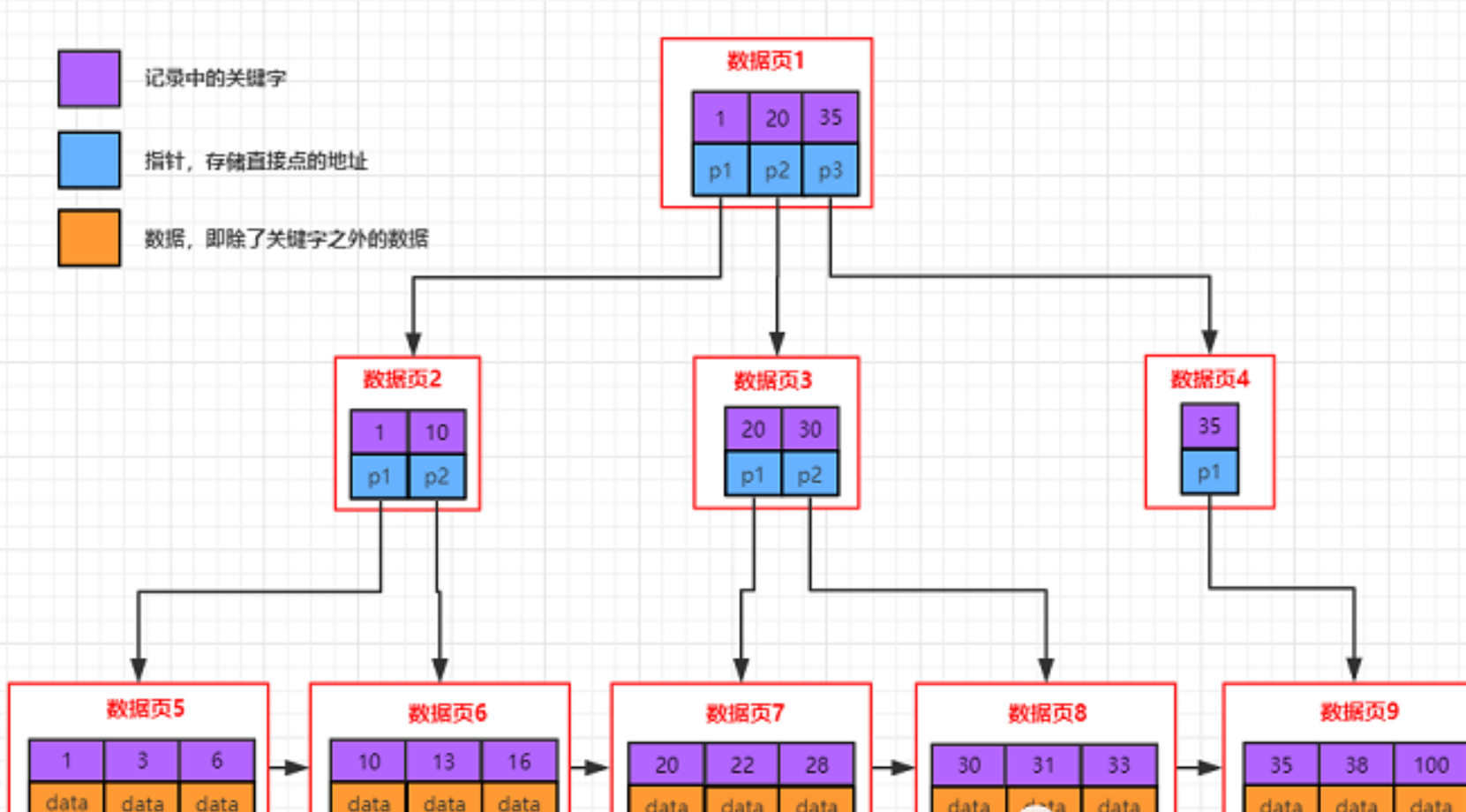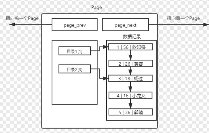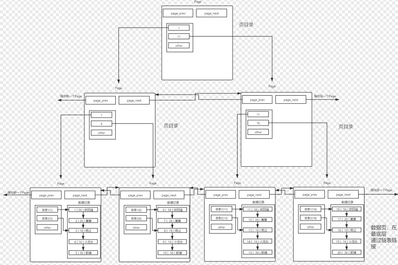存在一个目录页来管理页目录,目录页中的数据存放的就是指向的那一页中最小的数据。有数据,就可通过比较,找到该访问那个Page,进而通过指针,找到下一个Page。