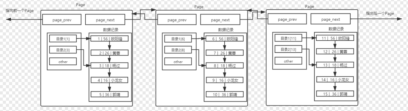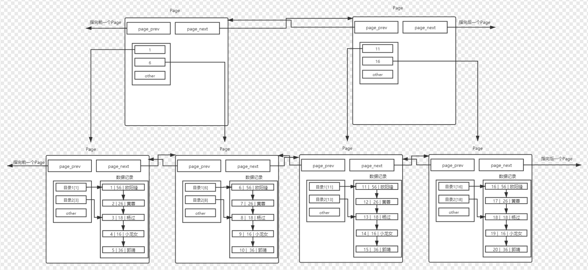不同的 Page ,在 MySQL 中,都是 16KB ,使用 prev 和 next 构成双向链表。因为有主键, MySQL 会默认按照主键给我们的数据进行排序,从上面的 Page 内数据记录可以看出,数据是有序且彼此关联的。
