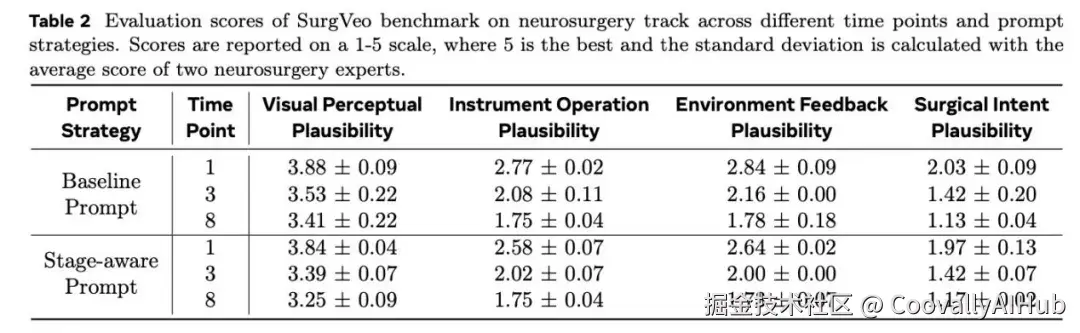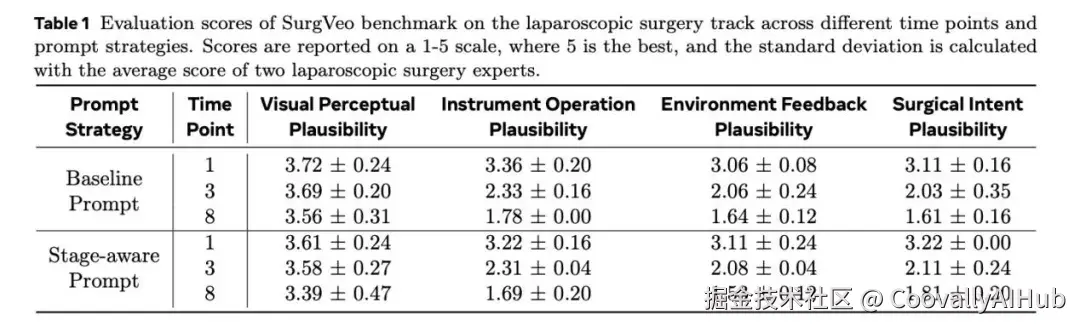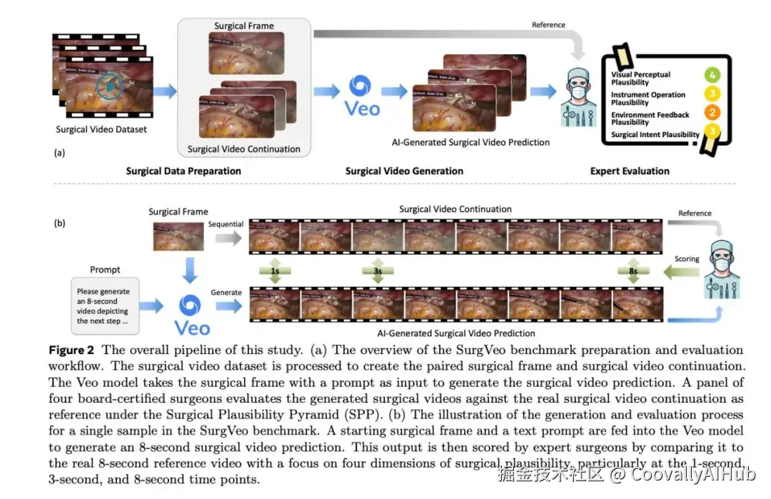 研究邀请了四位执业外科医生组成专家小组,使用SPP框架对Veo-3模型生成的视频进行打分。模型执行的是零样本预测任务:给定手术场景的起始帧和文本提示,生成接下来8秒的手术视频。
