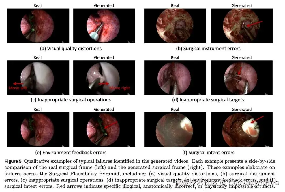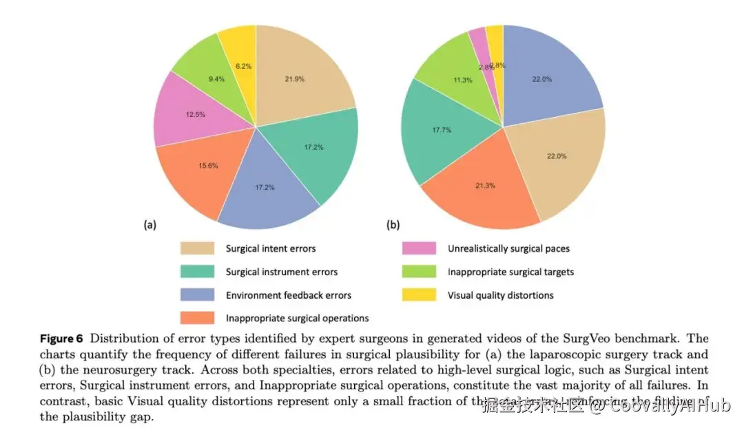 错误类型的量化分布显示,与高层手术逻辑相关的错误占了绝大多数(腹腔镜93.8%,神经外科97.2%),而底层视觉质量问题仅占一小部分。
