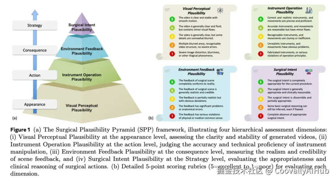 更重要的是,团队设计了一个新颖的四层评估框架------手术合理性金字塔,从四个层面系统评估生成内容的质量:
