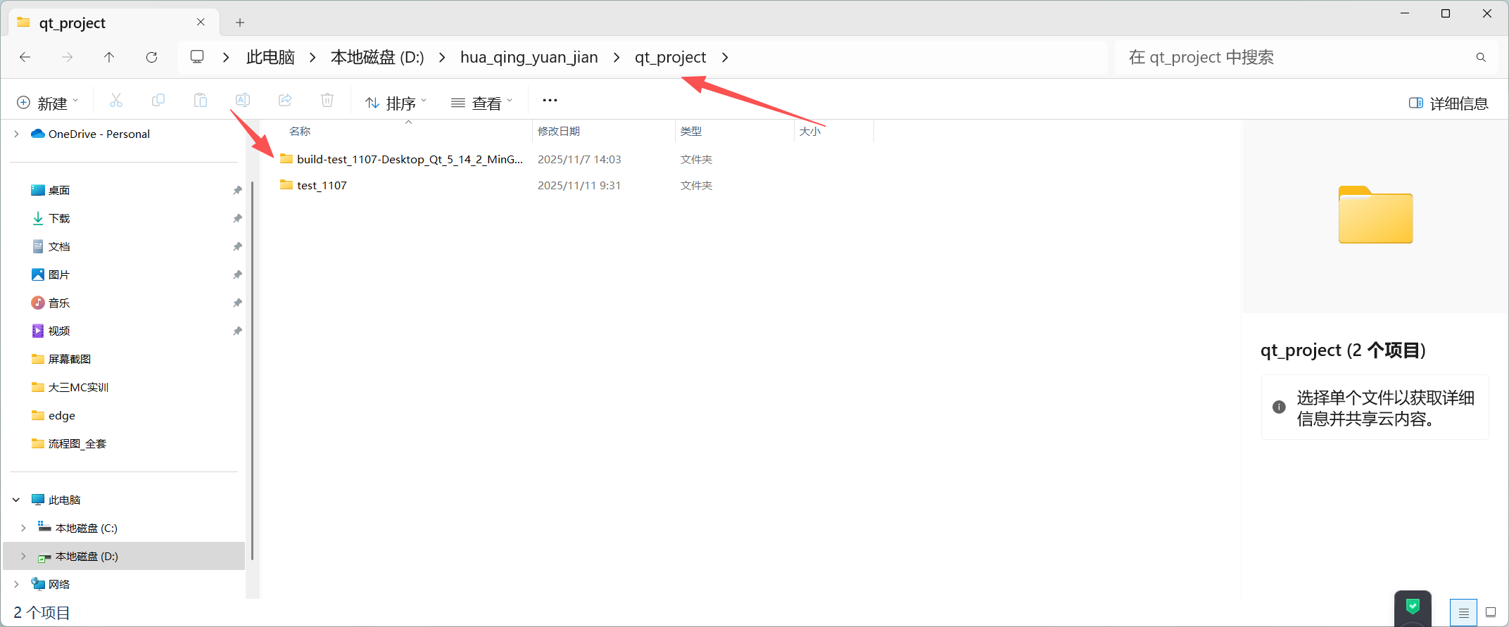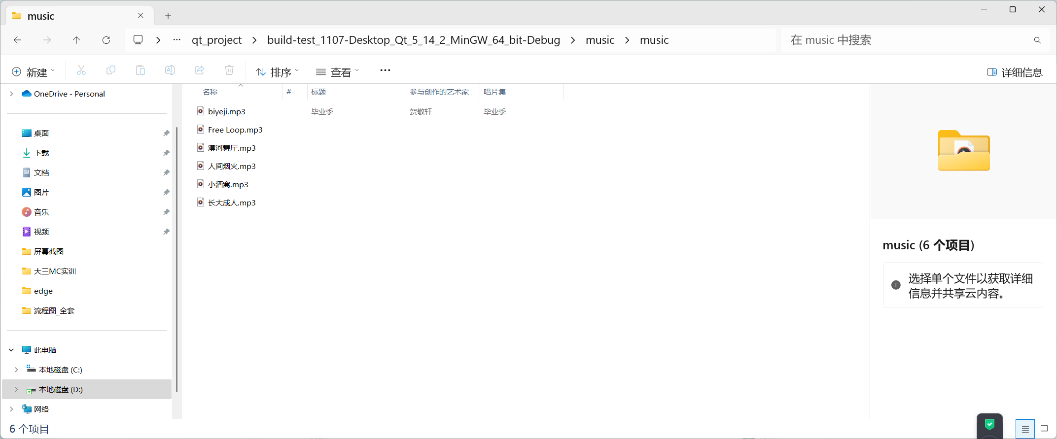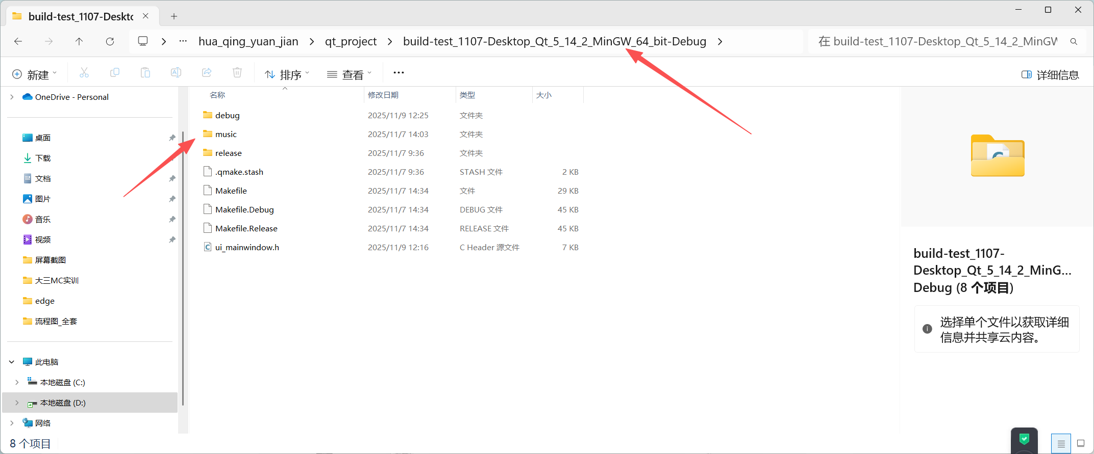 想要点击"打开"控件之后就跳转至音乐选择界面,则需要首先在创建的qt_project 下的build-test_1107-Desktop_Qt_5_14_2_MinGW_64_bit-Debug文件添加music文件(这是我们需要提前准备好的文件包)按如下界面放置即可