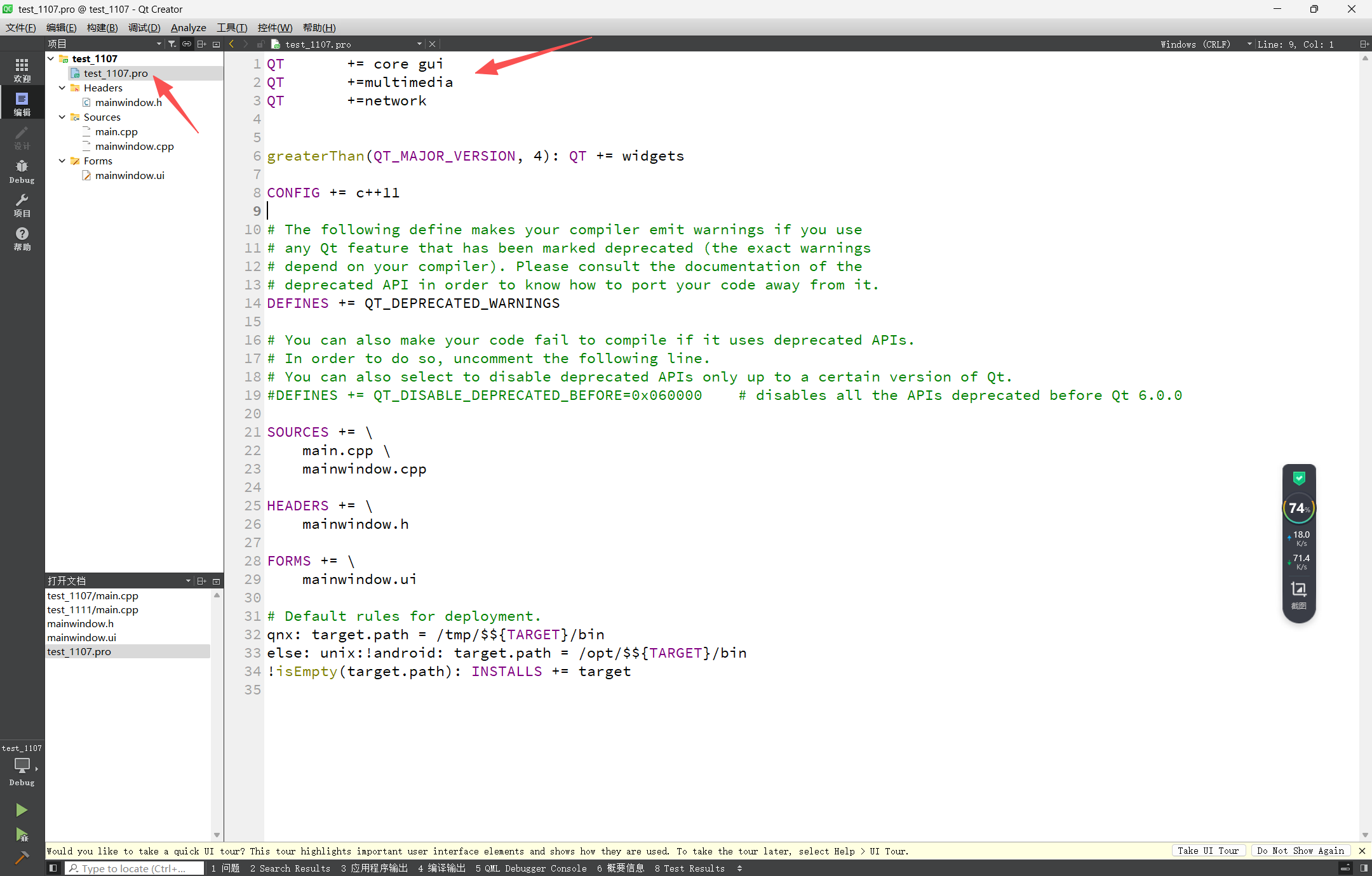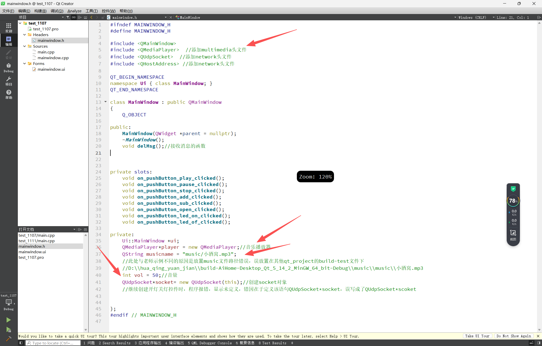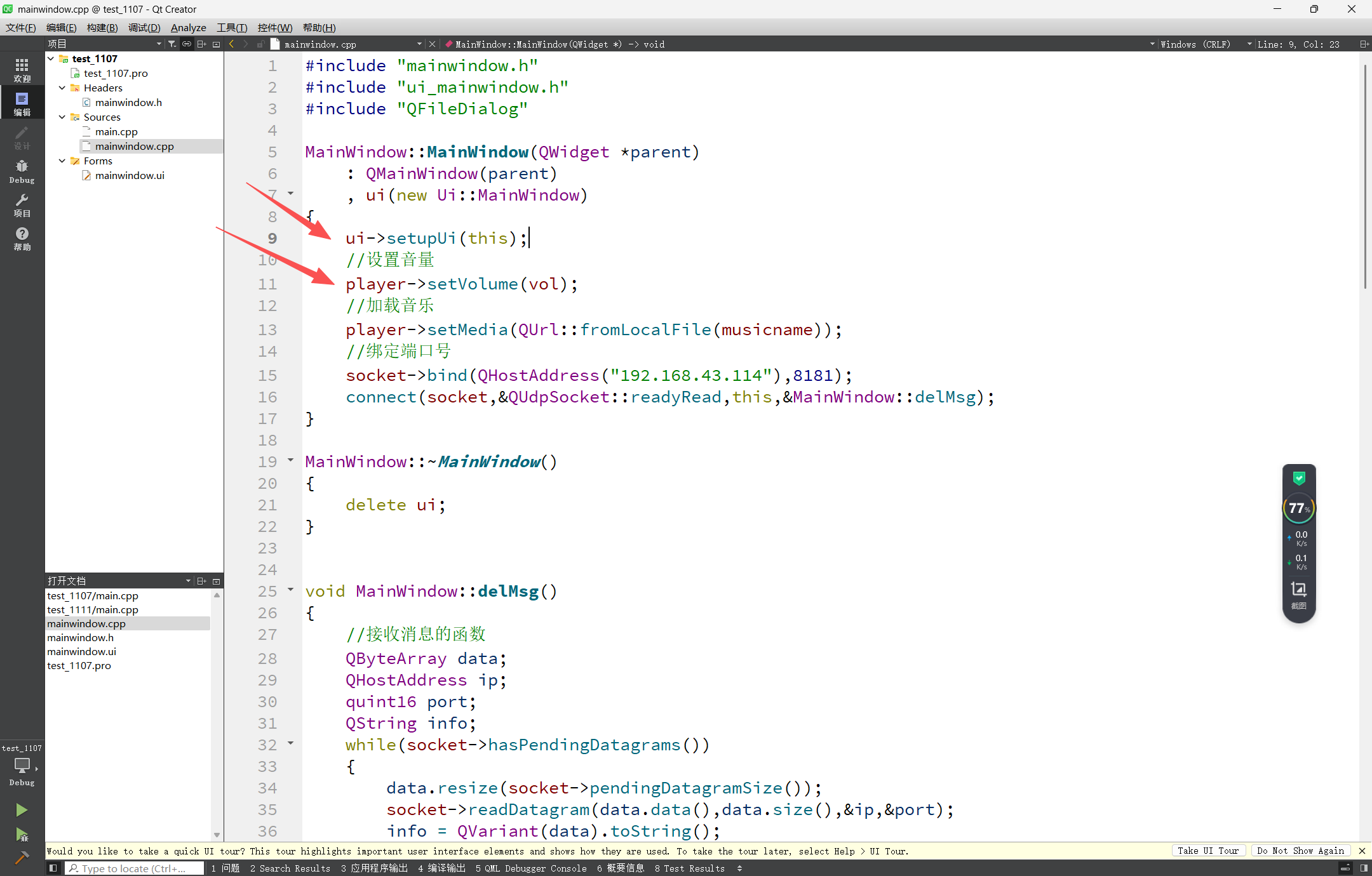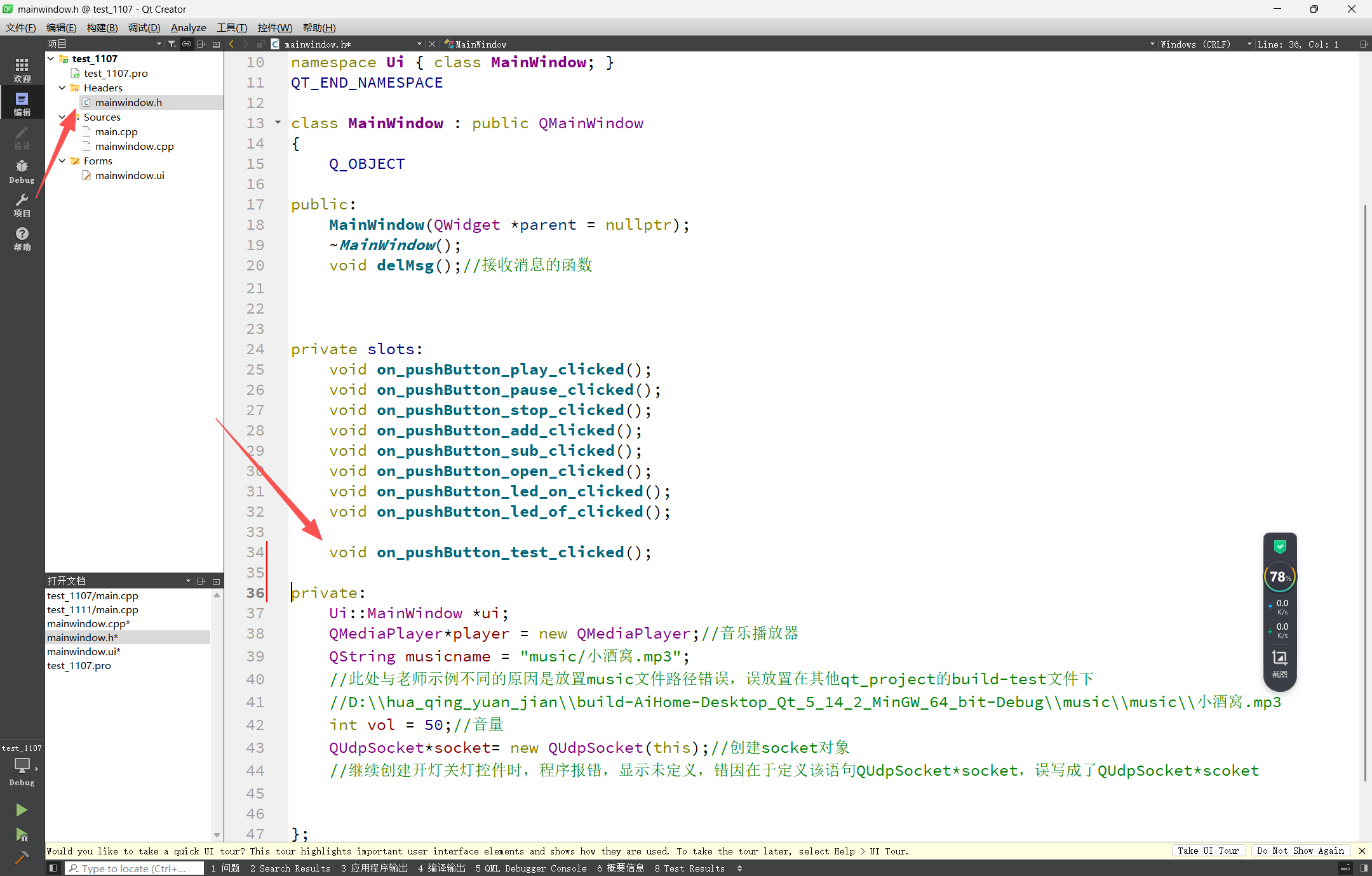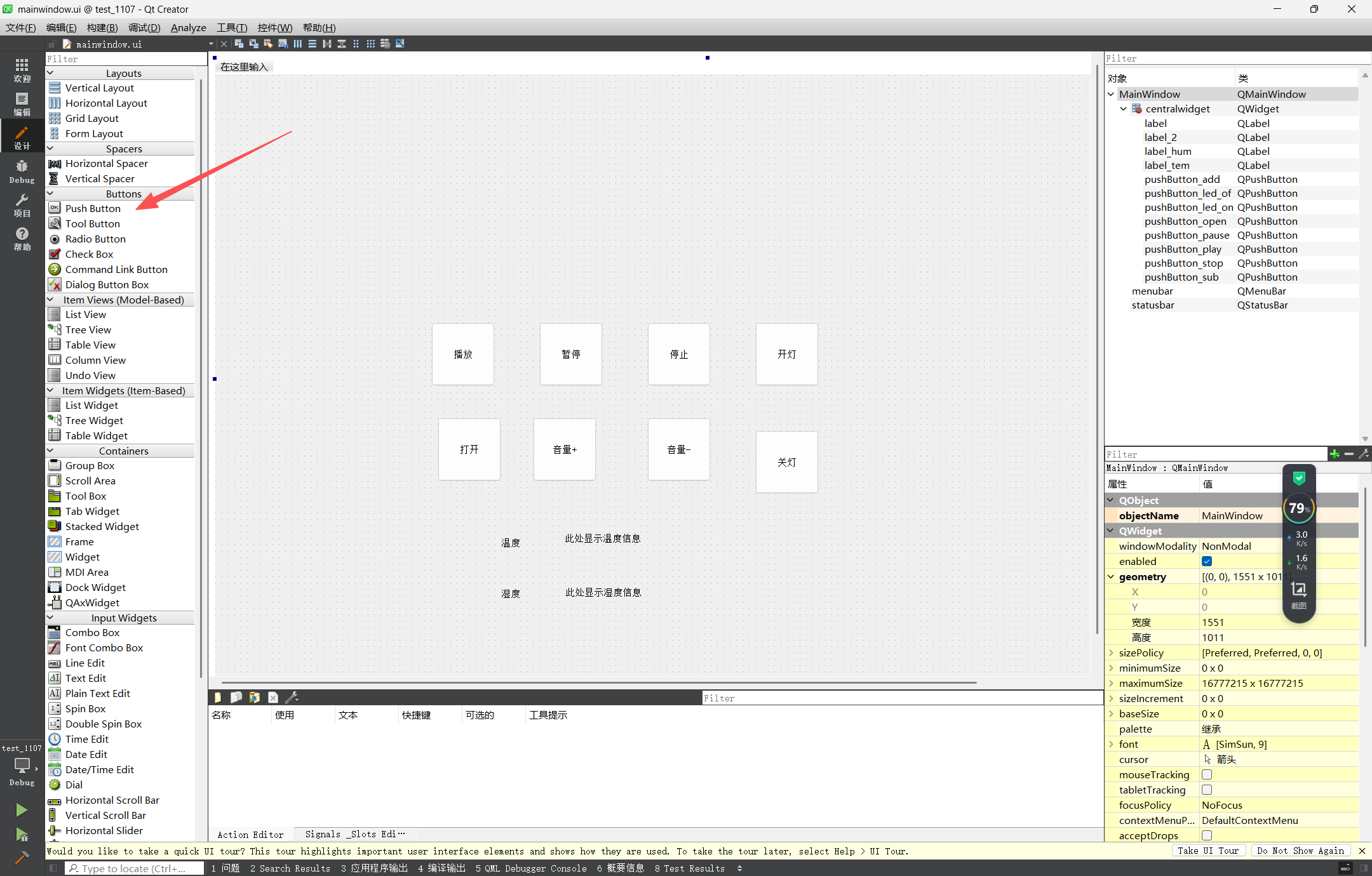 注意一下:如果想删去一个控件,则不单单需要在ui界面删除,同时需要删除转到槽之后产生的void Mainwindow函数以及mainwindow.h中的语句,进而构建后才不会报错