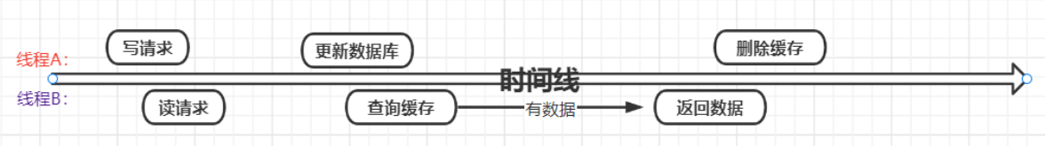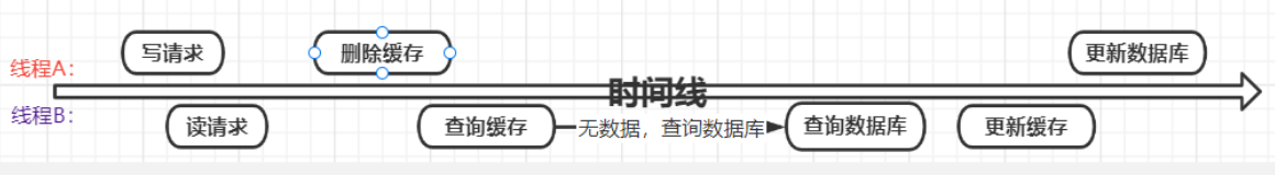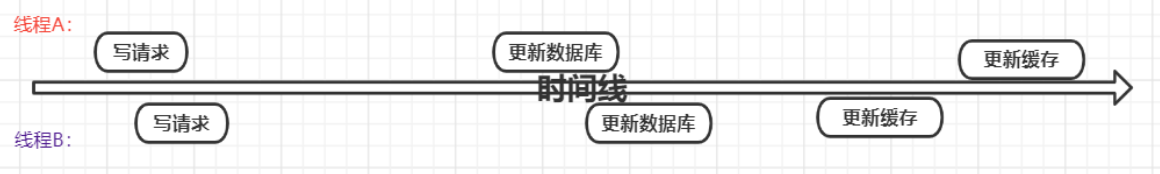 注意看上面的图片,当有两个写请求的线程,线程一比线程二先执行,反而是线程二先执行完。这时候,缓存保存的是A的数据(老数据),数据库保存的是B的数据(新数据),数据不一致了。