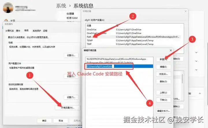 可通过以下步骤添加:打开系统属性 → 环境变量 → 编辑用户 PATH → 新建 → 添加上方的 Claude 安装路径。