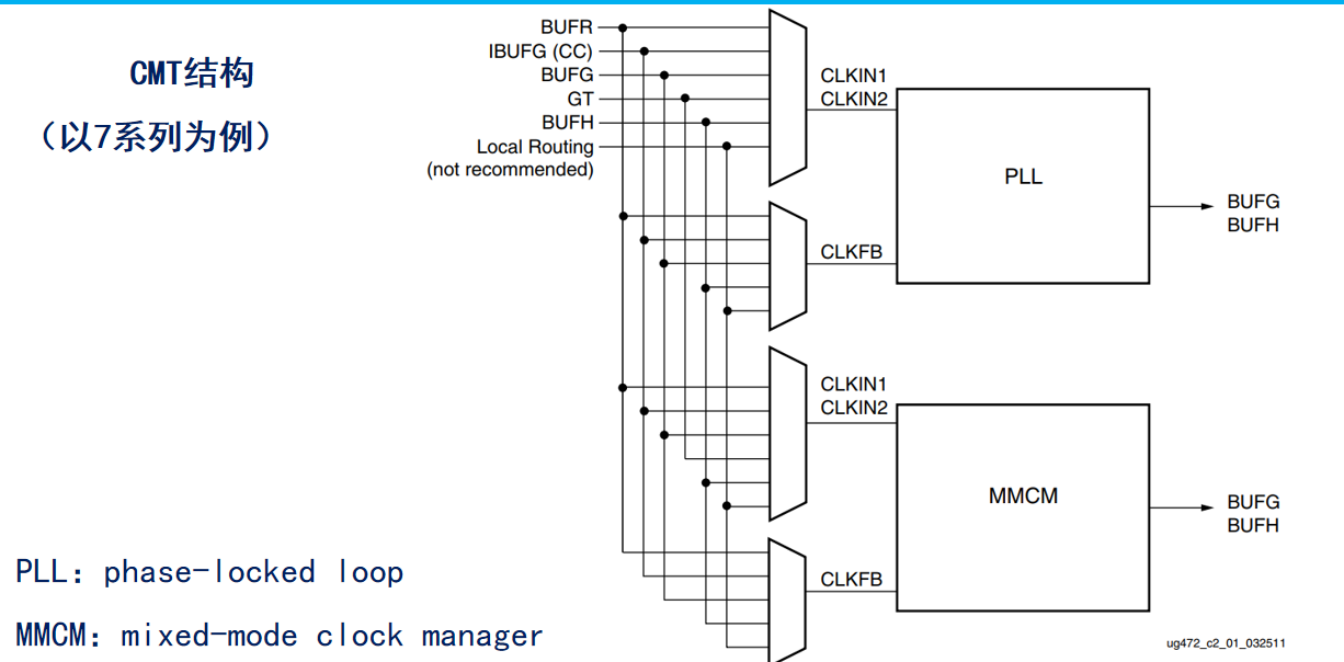 CMT(Clock Management Tiles):时钟管理单元,可以对时钟进行管理,具有时钟倍频、分频、相位偏移、可编程占空比和优化抖动等功能。