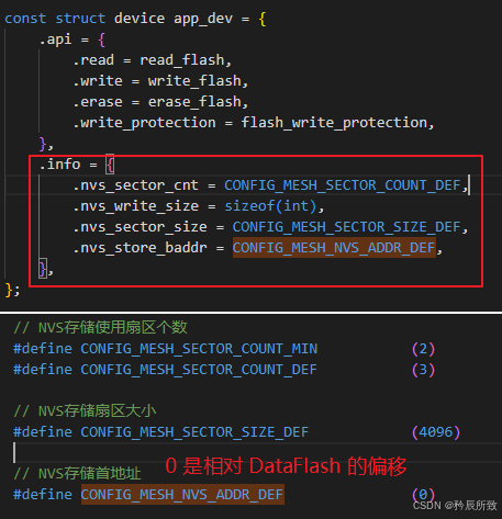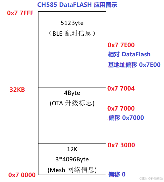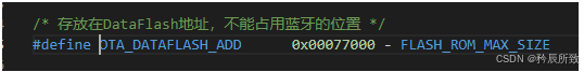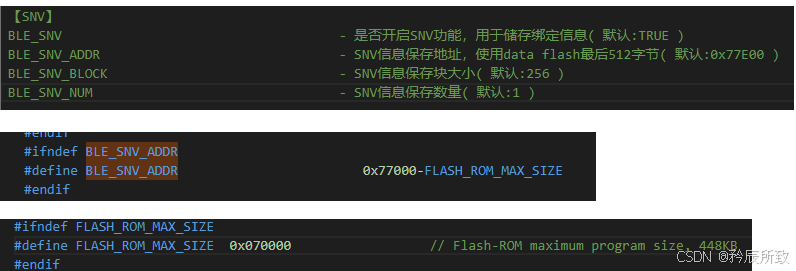 上面的0x0007 0000 ~ 0x 0007 8000 区,即 DataFlash 区是留给客户保存数据的部分,但是如果使用蓝牙应用,蓝牙配对,Mesh 组网,OTA 升级等的数据也被保存在这部分区域,用户需要注意一下如果使用到对应的部分功能自己的数据不要和这些数据重叠了,当然用户也可以自己修改地址存放,直接在程序中修改宏定义即可 。