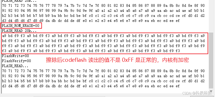首先是大家跑示例会发现读取 Codeflash ,擦除后读出来并不是 0xFF,这是正常的,MCU内核有加解密。