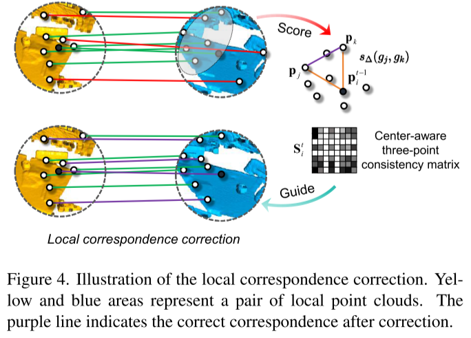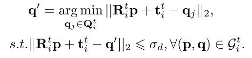 识别高质量对应点后,利用它们估计局部变换T^t_i{R^t_i, t^t_i},然后对整个局部区域的对应点进行校正: