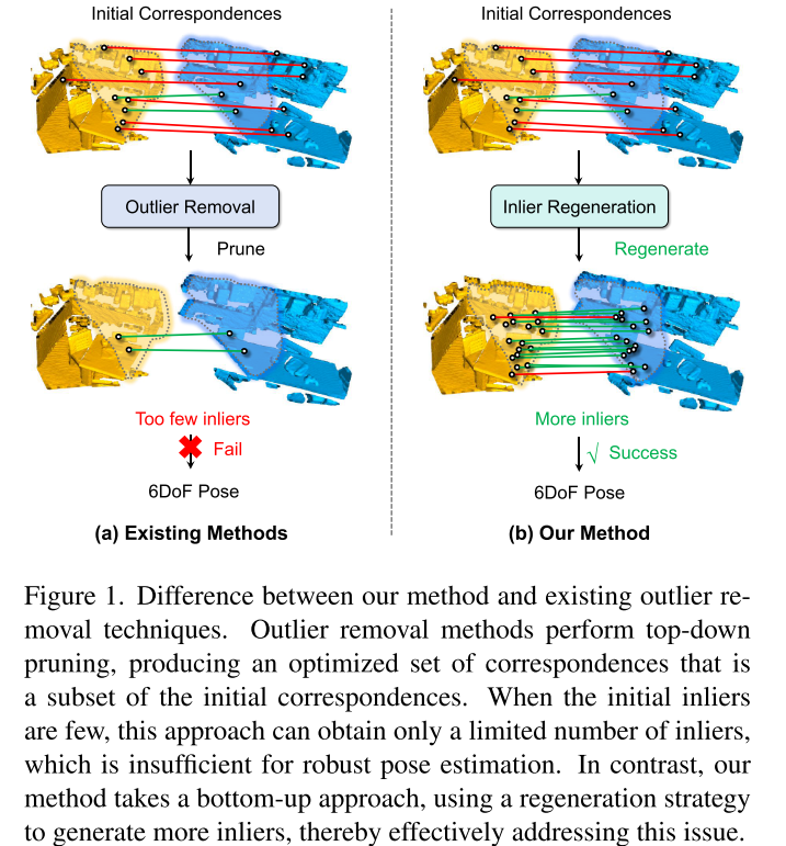 核心问题:这些方法都采用"自上而下的剪枝"策略(如图1(a)所示),只能从初始对应点中筛选,当初始正确对应点很少时,即使全部识别出来也无法支持鲁棒配准。