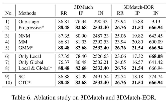 | 方法 | 3DMatch RR(%) | 3DMatch IN | 3DLoMatch RR(%) |
