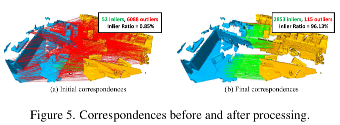 - 在低重叠、高噪声场景下,特征匹配会产生大量错误对应点