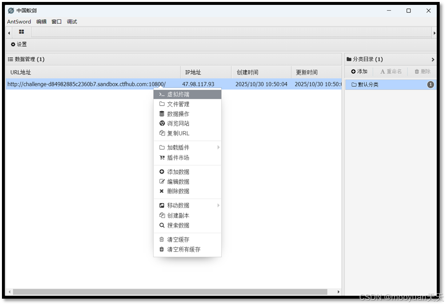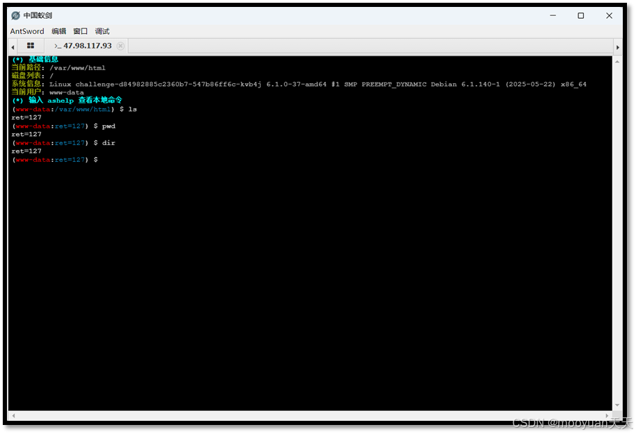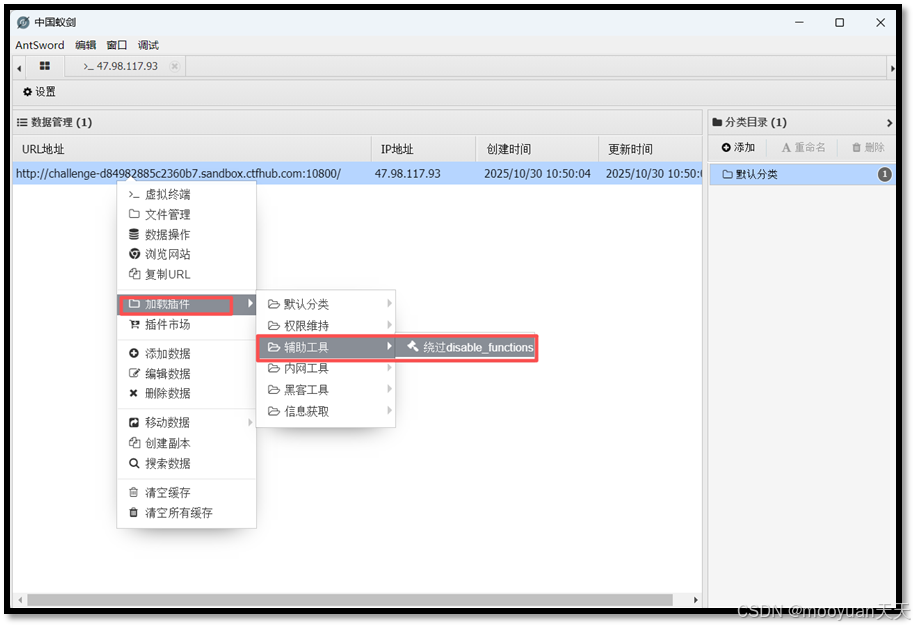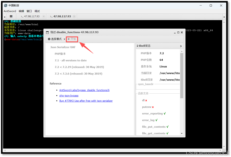 我们通过蚁剑工具的disable function插件绕过服务器的限制,具体操作步骤如下所示。