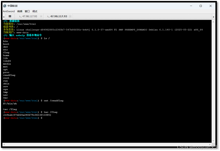 在新的终端中输入ls /、cat /readflag和tac /flag命令成功获取到flag,如下所示。