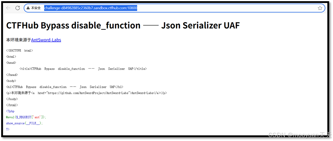 这是一个基于PHP JsonSerializer组件的UAF(Use-After-Free)风险的利用环境,攻击者通过eval($_REQUEST['ant'])注入恶意代码,旨在绕过PHP的disable_functions安全限制。利用JSON序列化过程中释放内存后未及时清理的指针,通过精心构造的请求触发内存重用,最终实现命令执行和Webshell权限维持,源码如下所示。