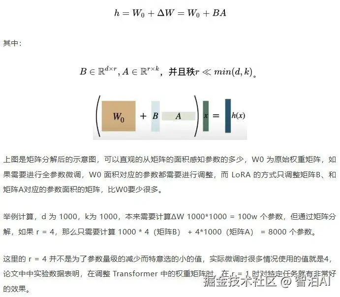 但如果微调的数据,还是一个d*k维度的矩阵,参数量就很多。LoRA 通过将后者表示为低秩分解,来减少参数的量级。