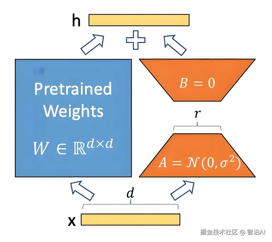 原始矩阵维度较高,假设为 dk 维矩阵W0,要想进行矩阵调整,并且保持矩阵的数据(为了重用),最简单方式是使用矩阵加法,增加一个 dk 维度的矩阵ΔW。