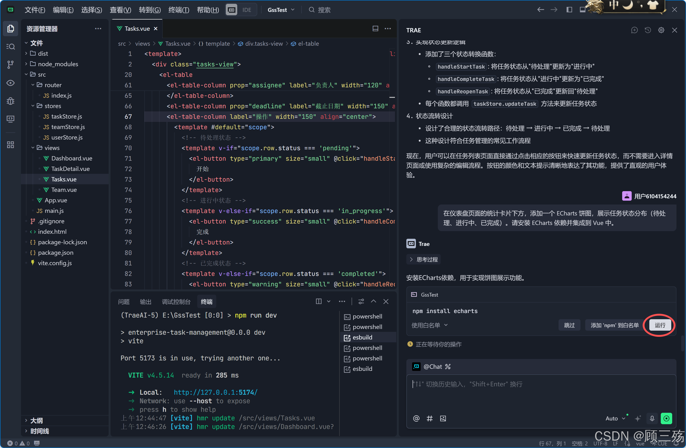 "在仪表盘页面的统计卡片下方,添加一个 ECharts 饼图,展示任务状态分布(待处理、进行中、已完成)。请安装 ECharts 依赖并集成到 Vue 中。"