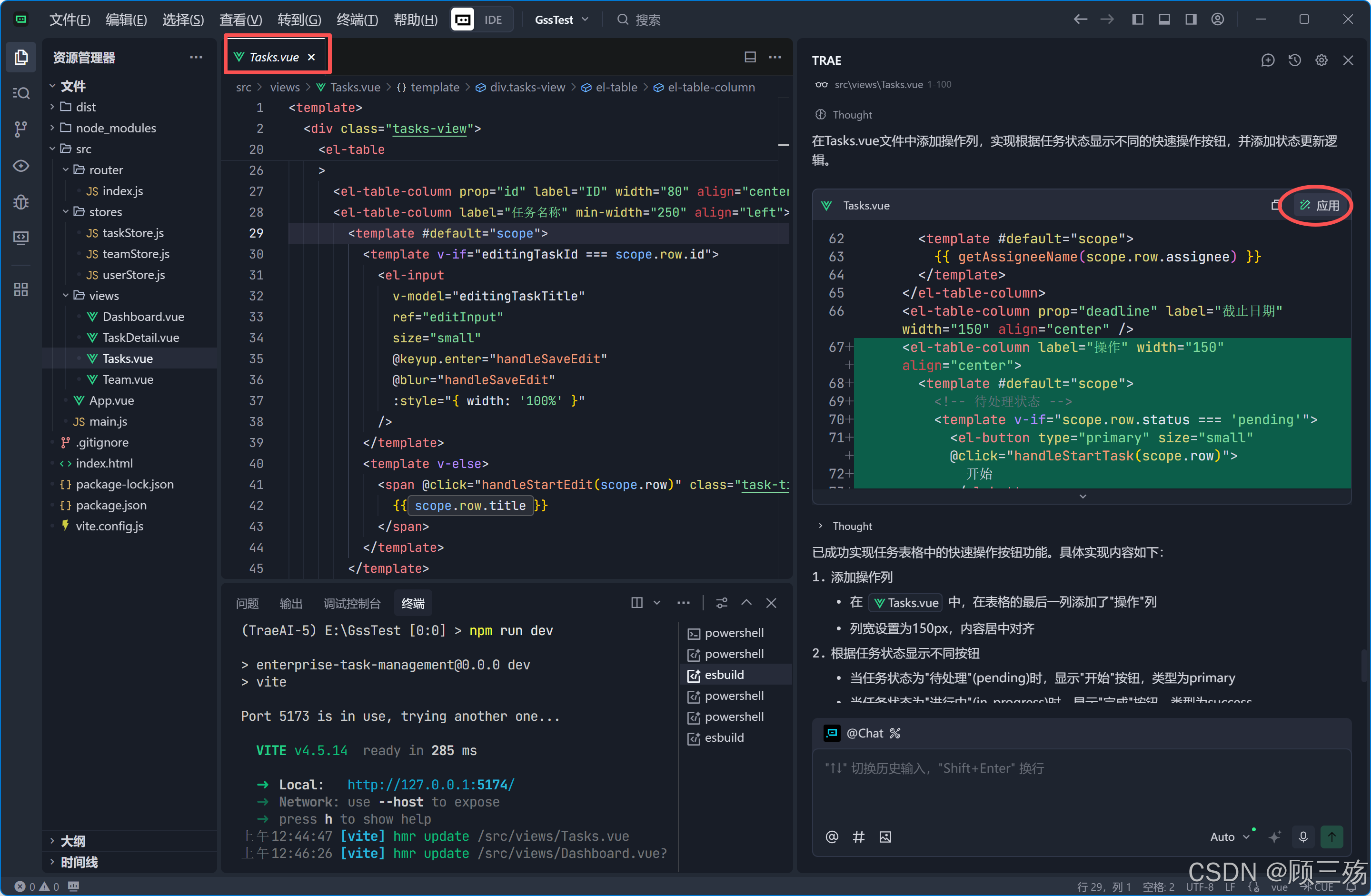 taskStore中添加changeTaskStatusaction在操作列中添加条件渲染的按钮