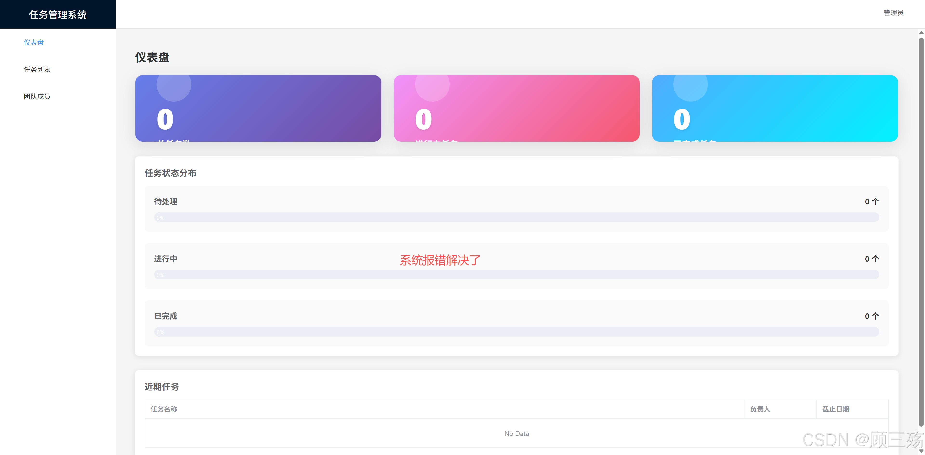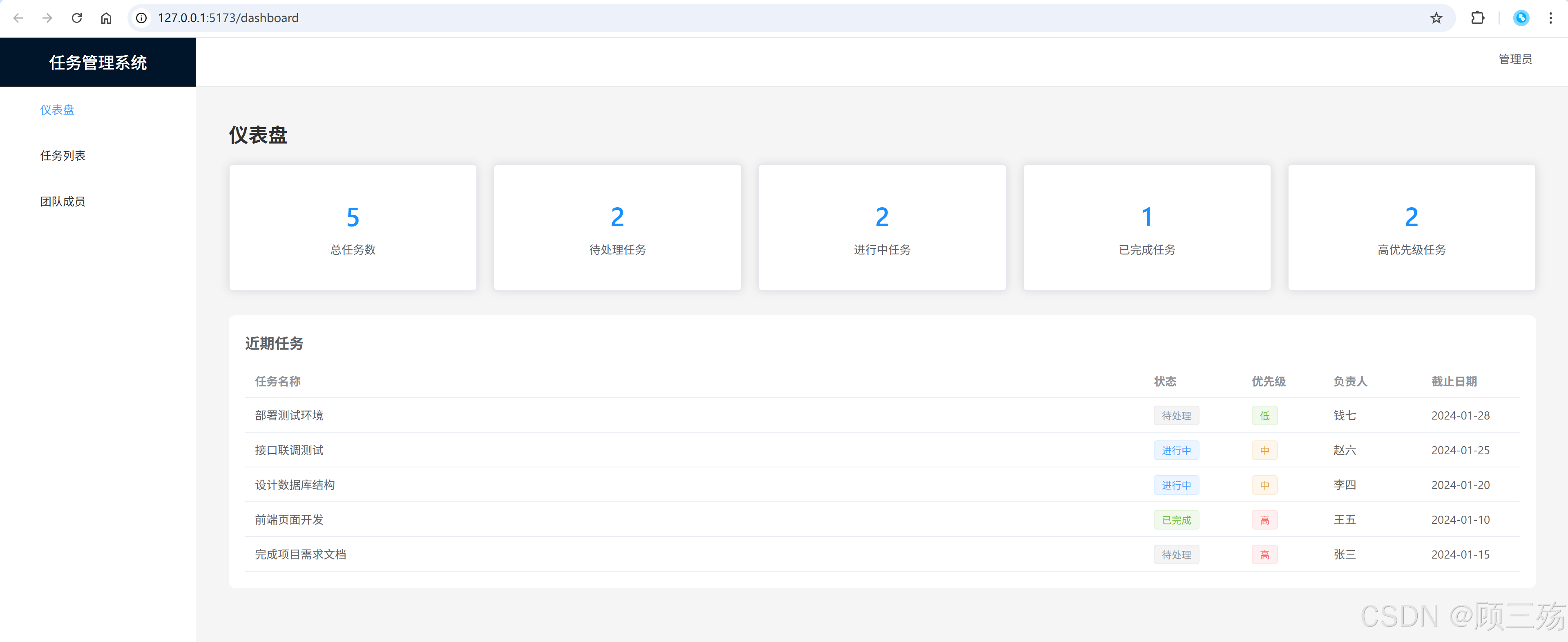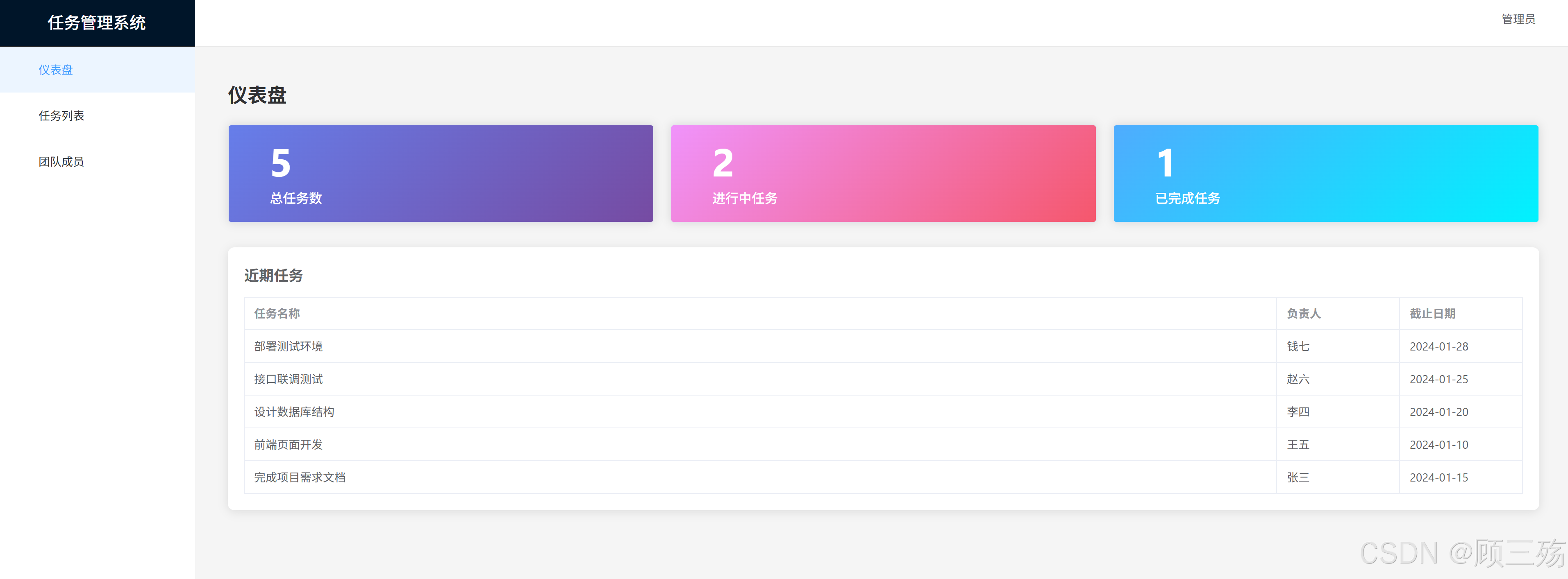 顶部放置三个统计卡片:总任务数、进行中任务数、已完成任务数。