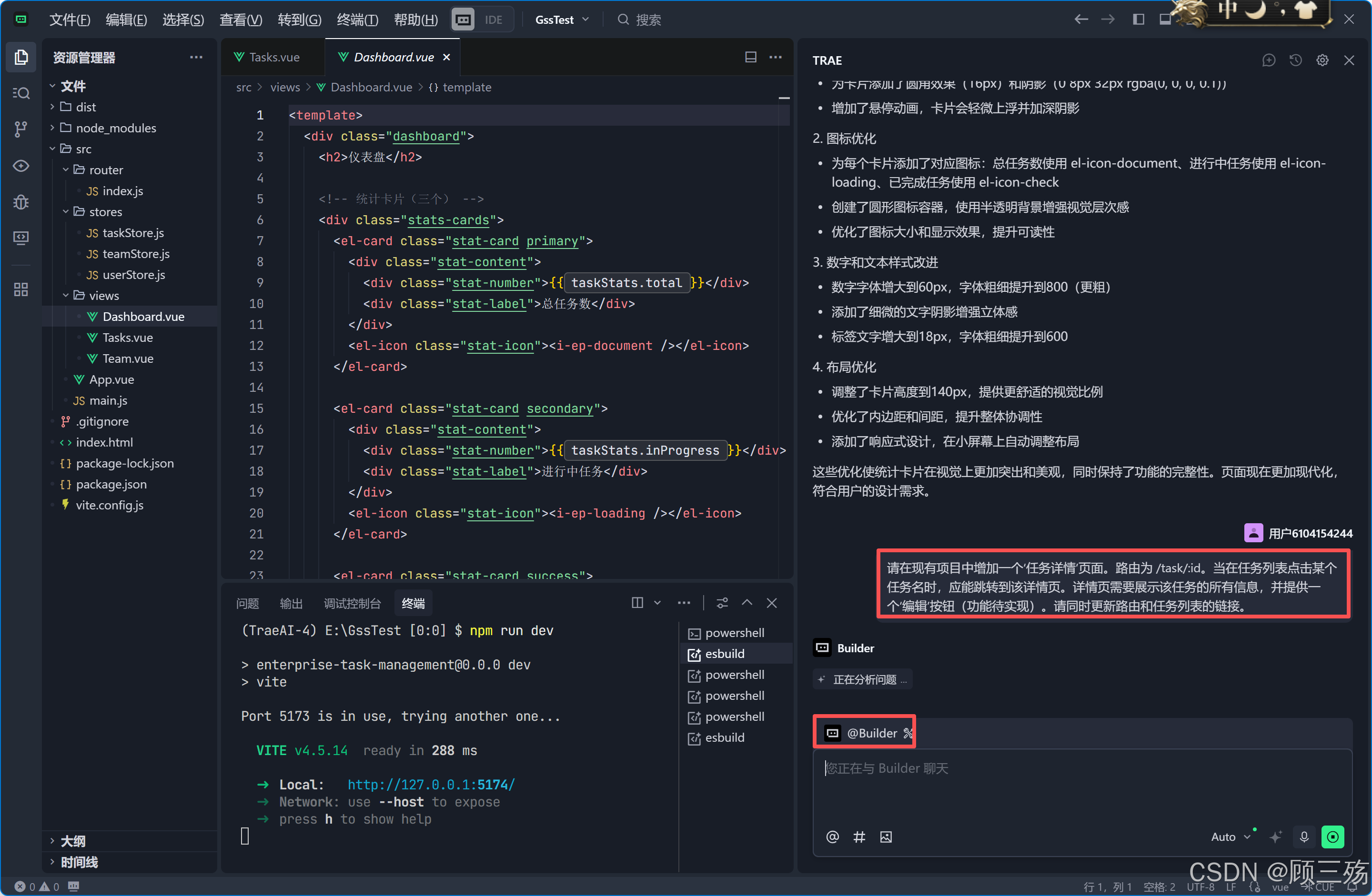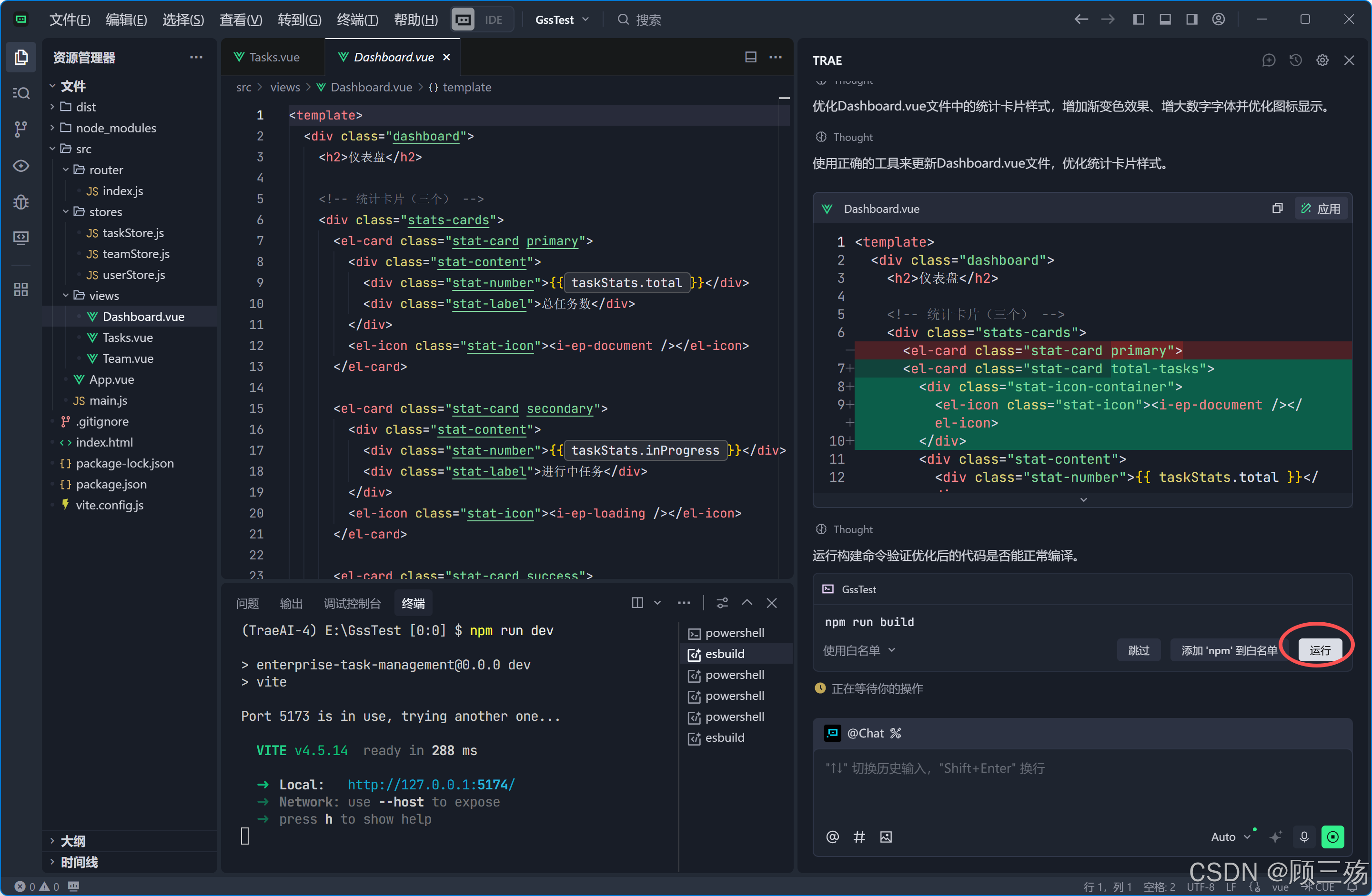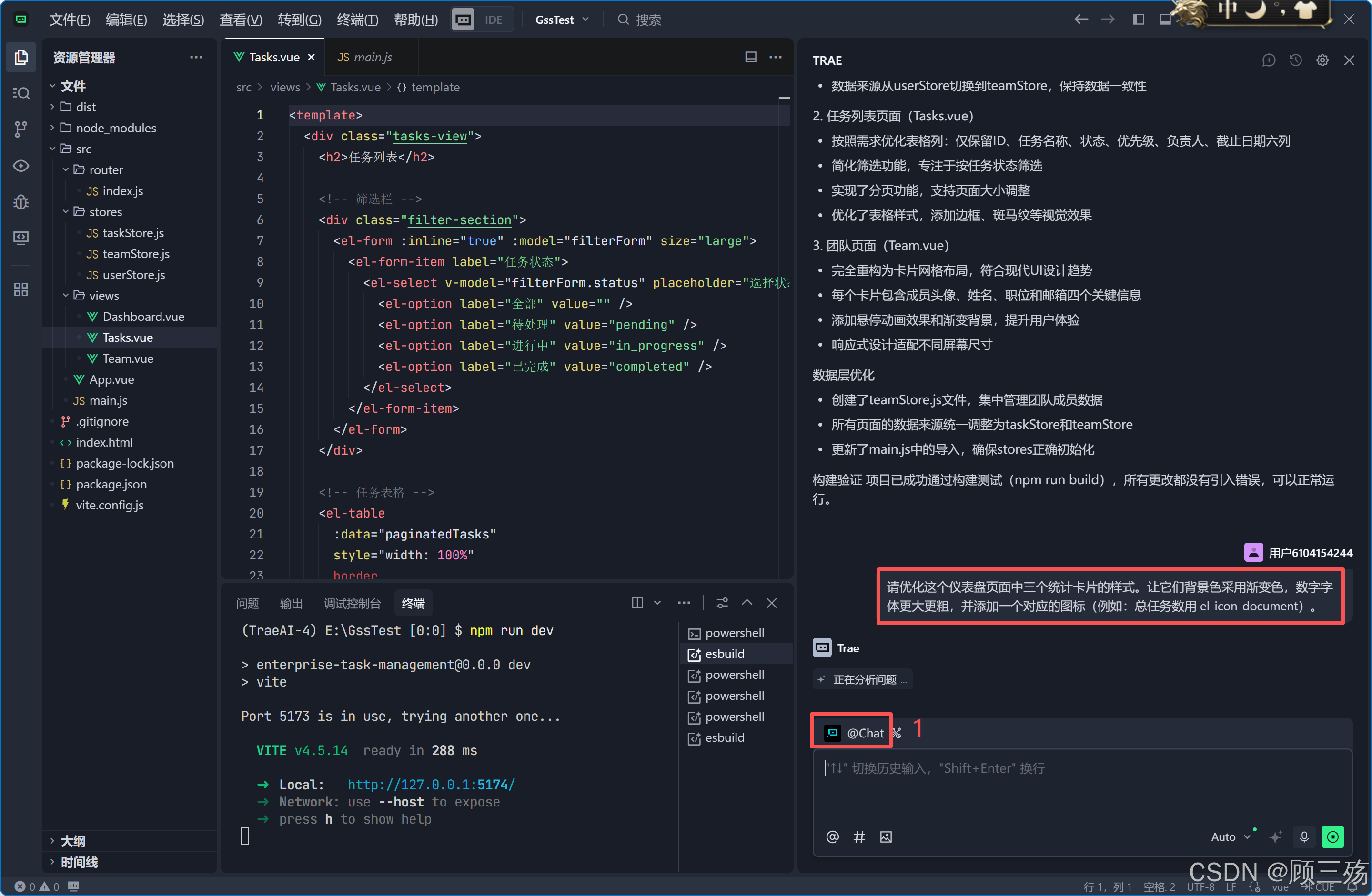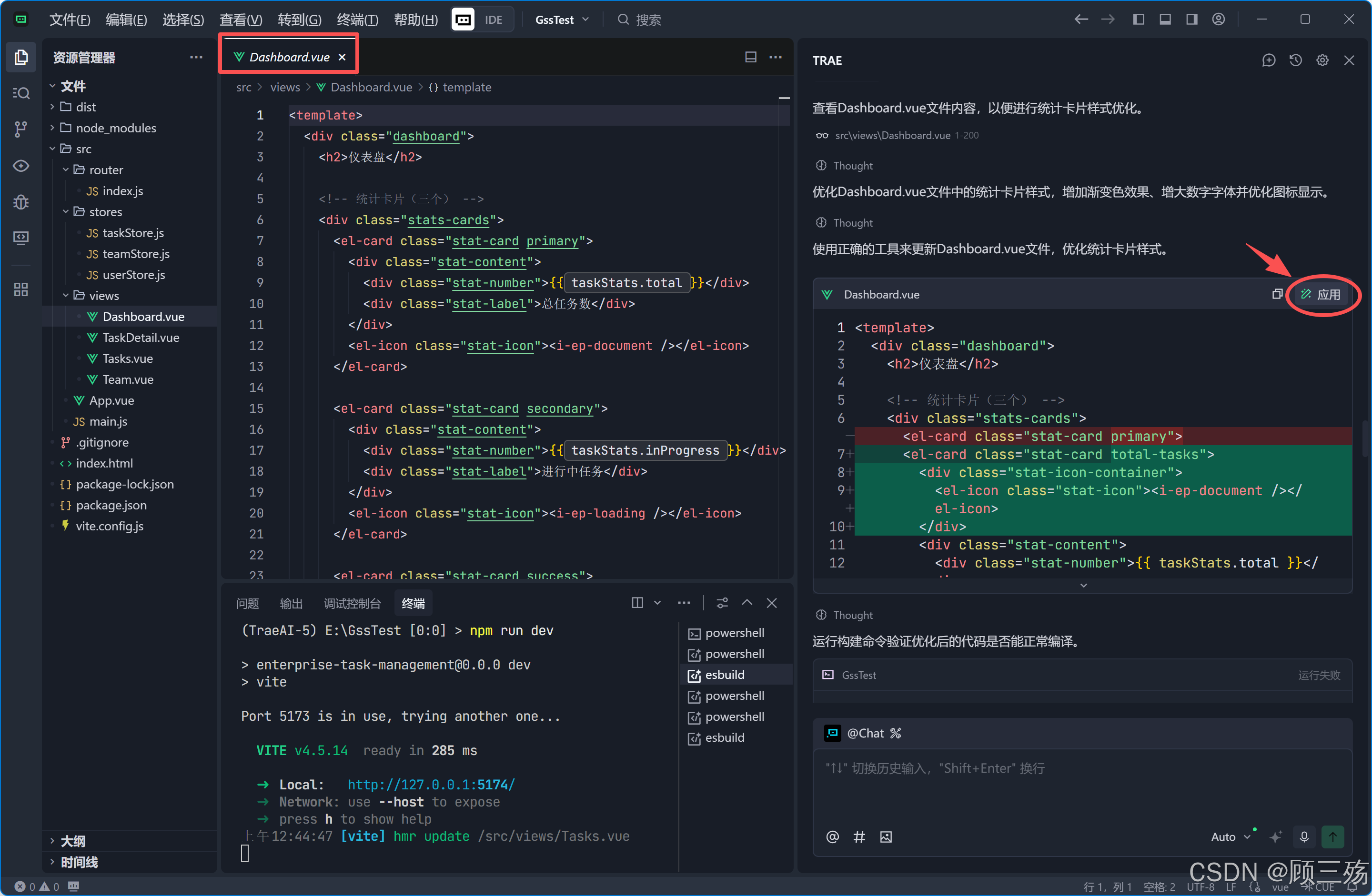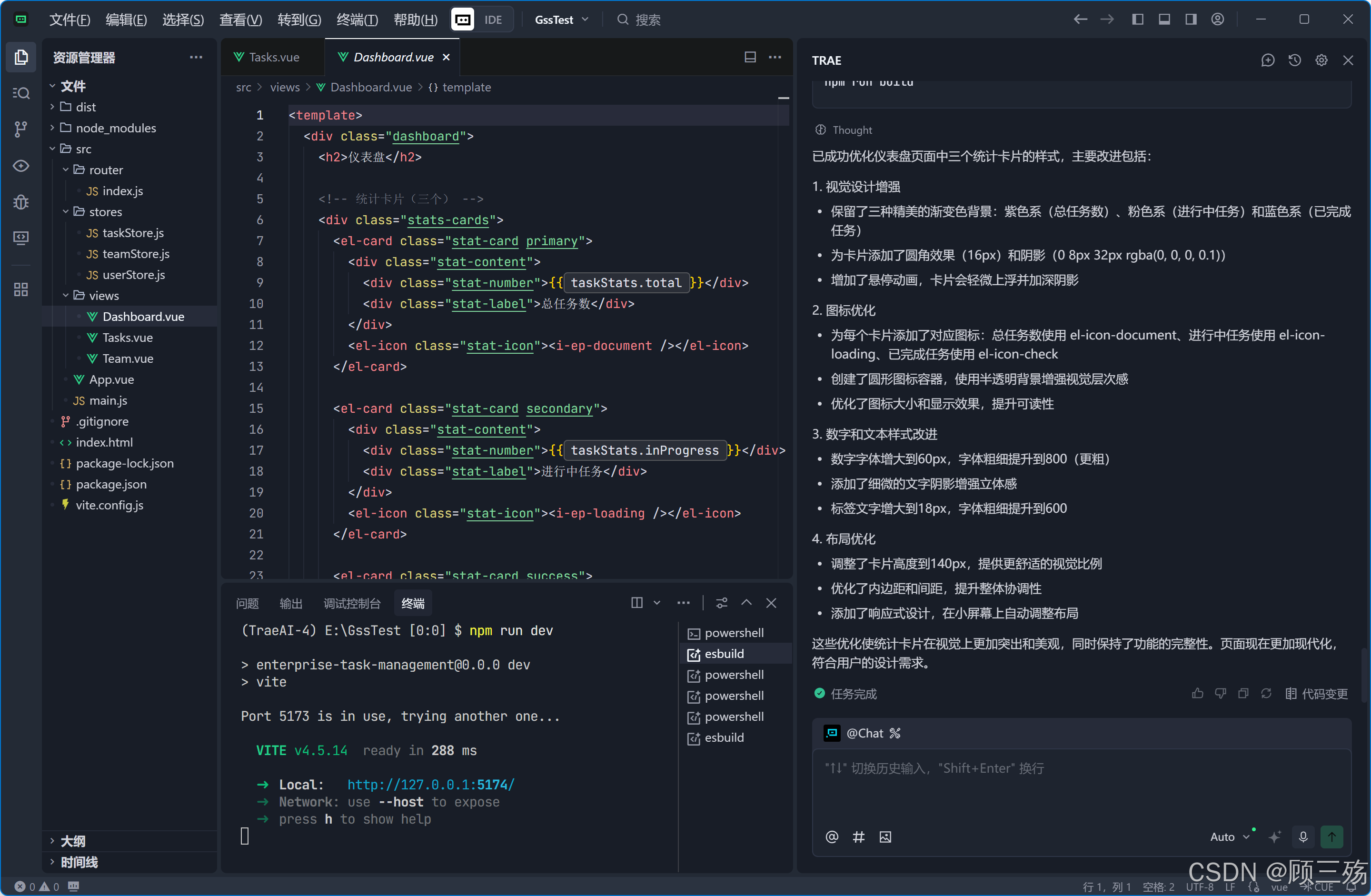 2. 切换至 @Chat 智能体进行精细调整: 打开src/views/DashboardView.vue文件指令(启动 @Chat 智能体): "请优化这个仪表盘页面中三个统计卡片的样式。让它们背景色采用渐变色,数字字体更大更粗,并添加一个对应的图标(例如:总任务数用