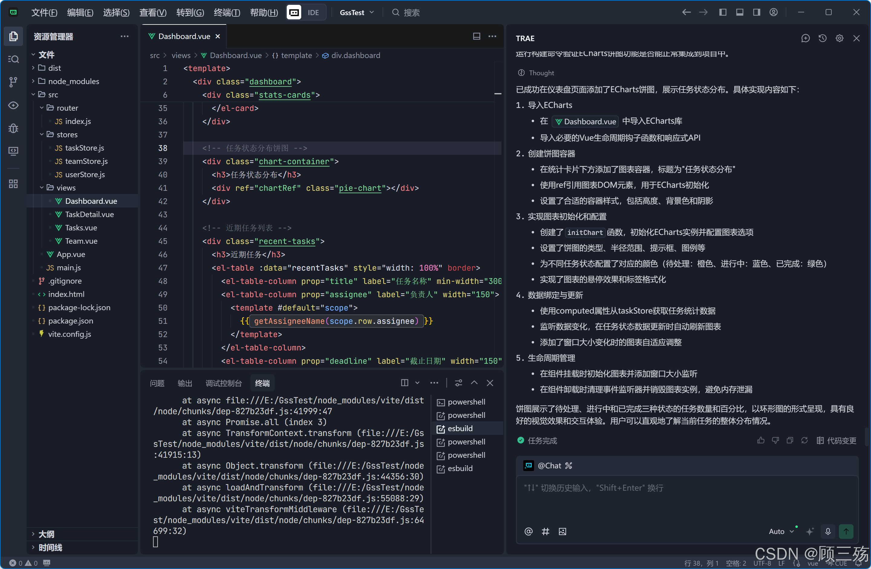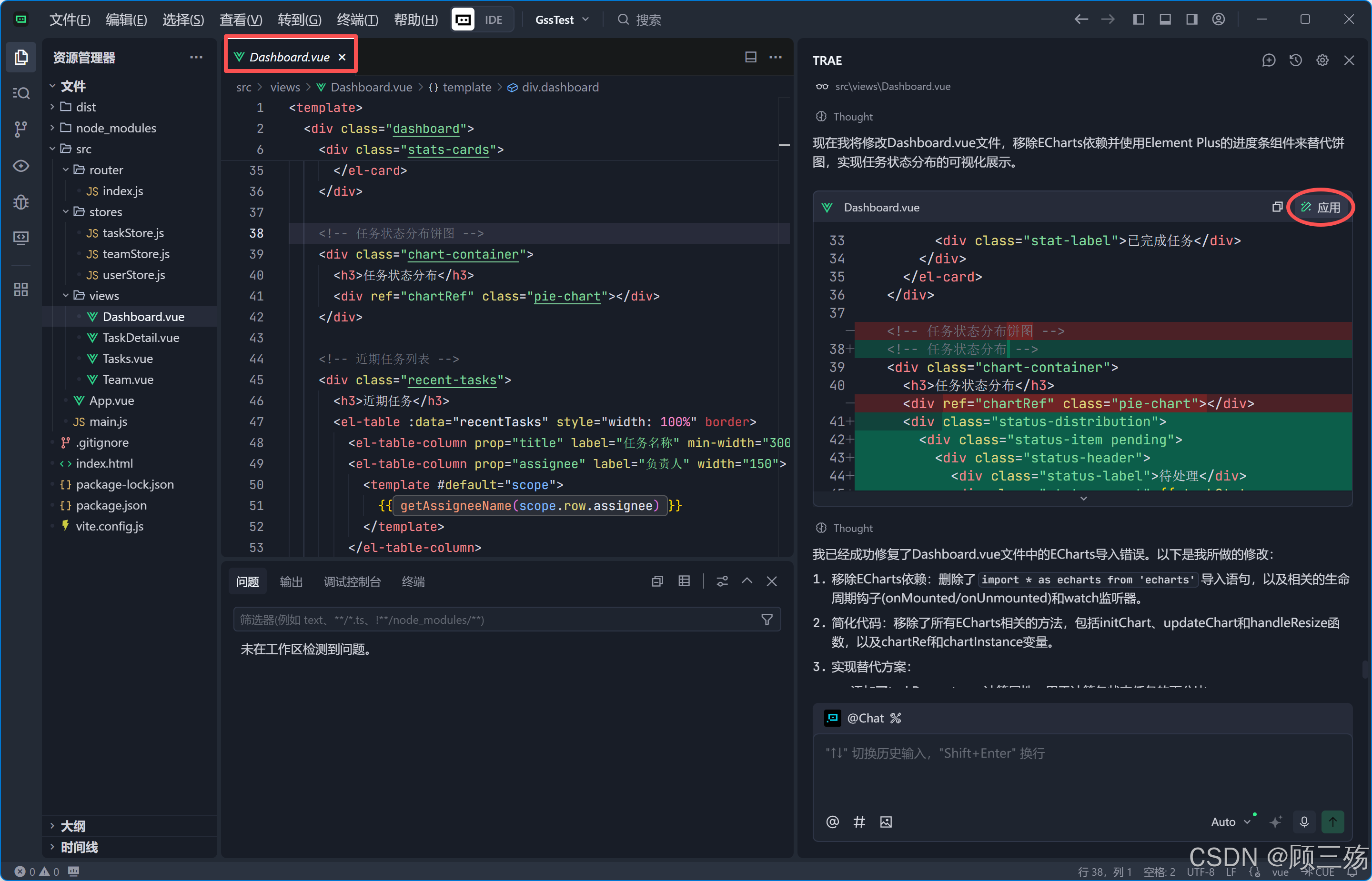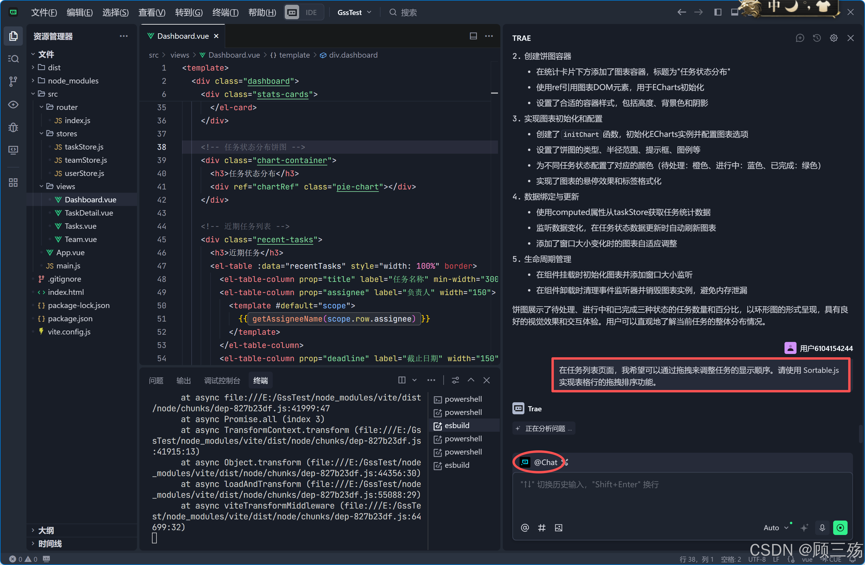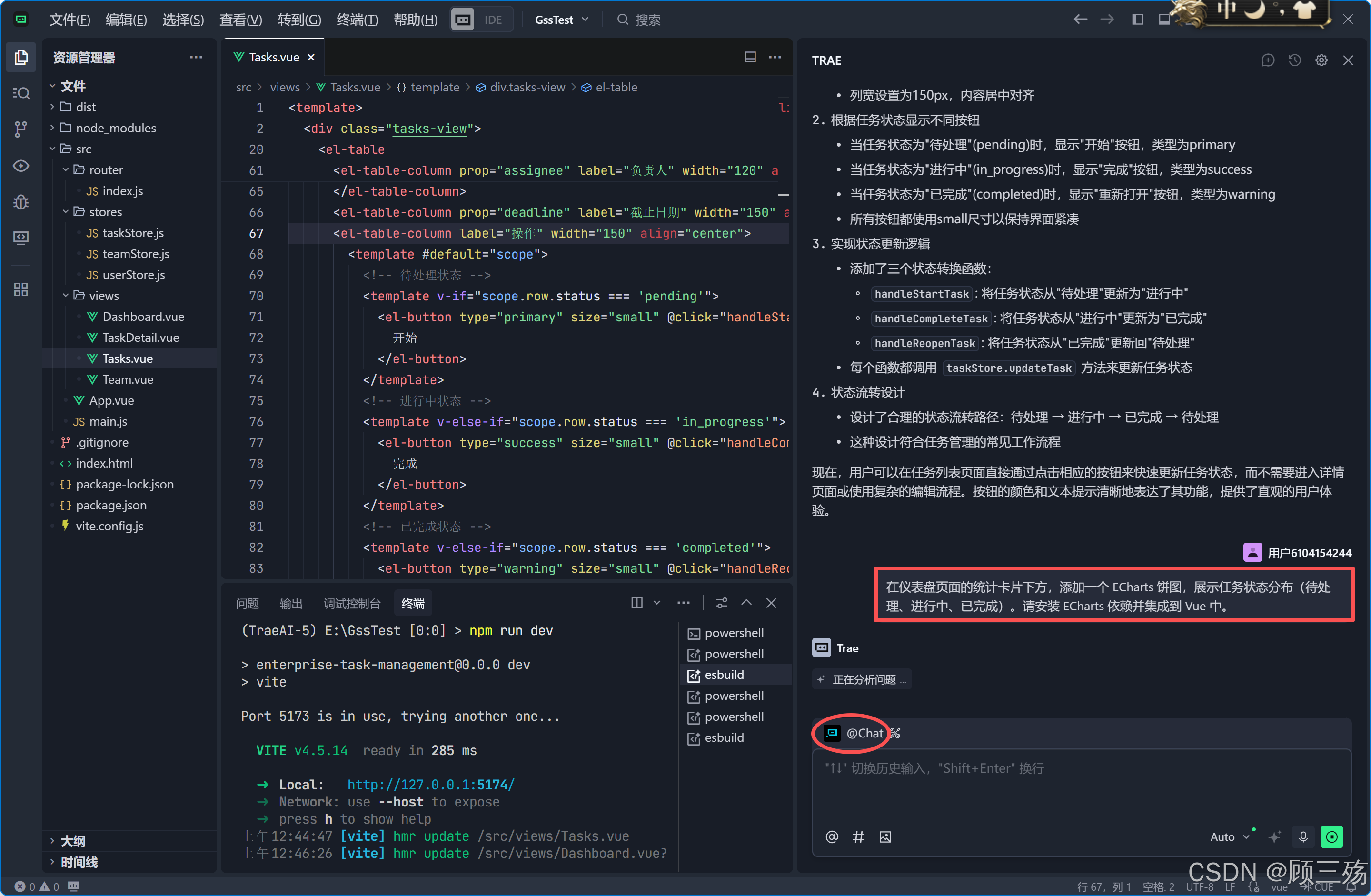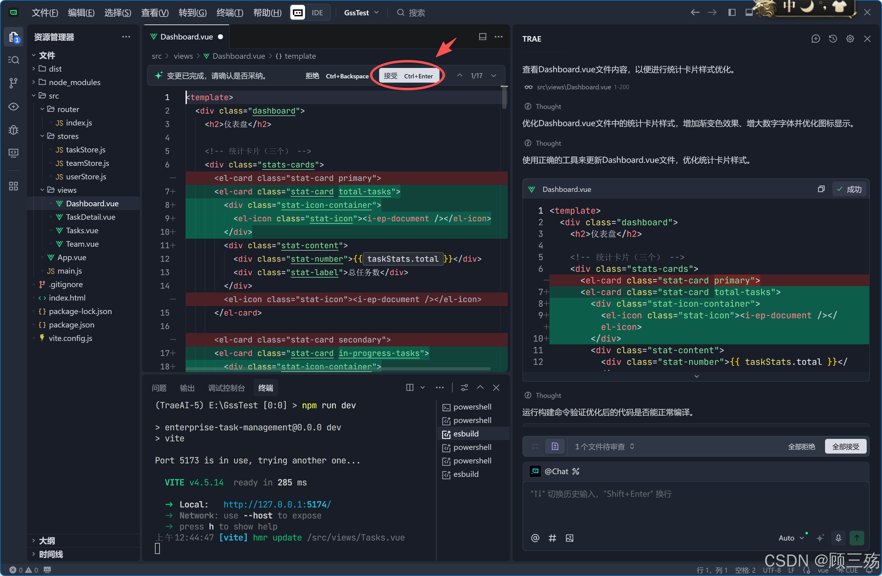 2. 切换至 @Chat 智能体进行精细调整: 打开src/views/DashboardView.vue文件指令(启动 @Chat 智能体): "请优化这个仪表盘页面中三个统计卡片的样式。让它们背景色采用渐变色,数字字体更大更粗,并添加一个对应的图标(例如:总任务数用