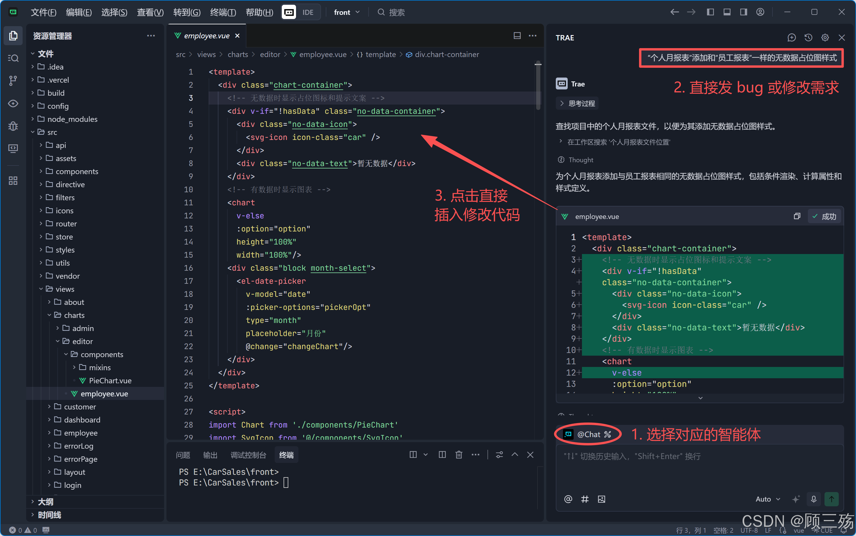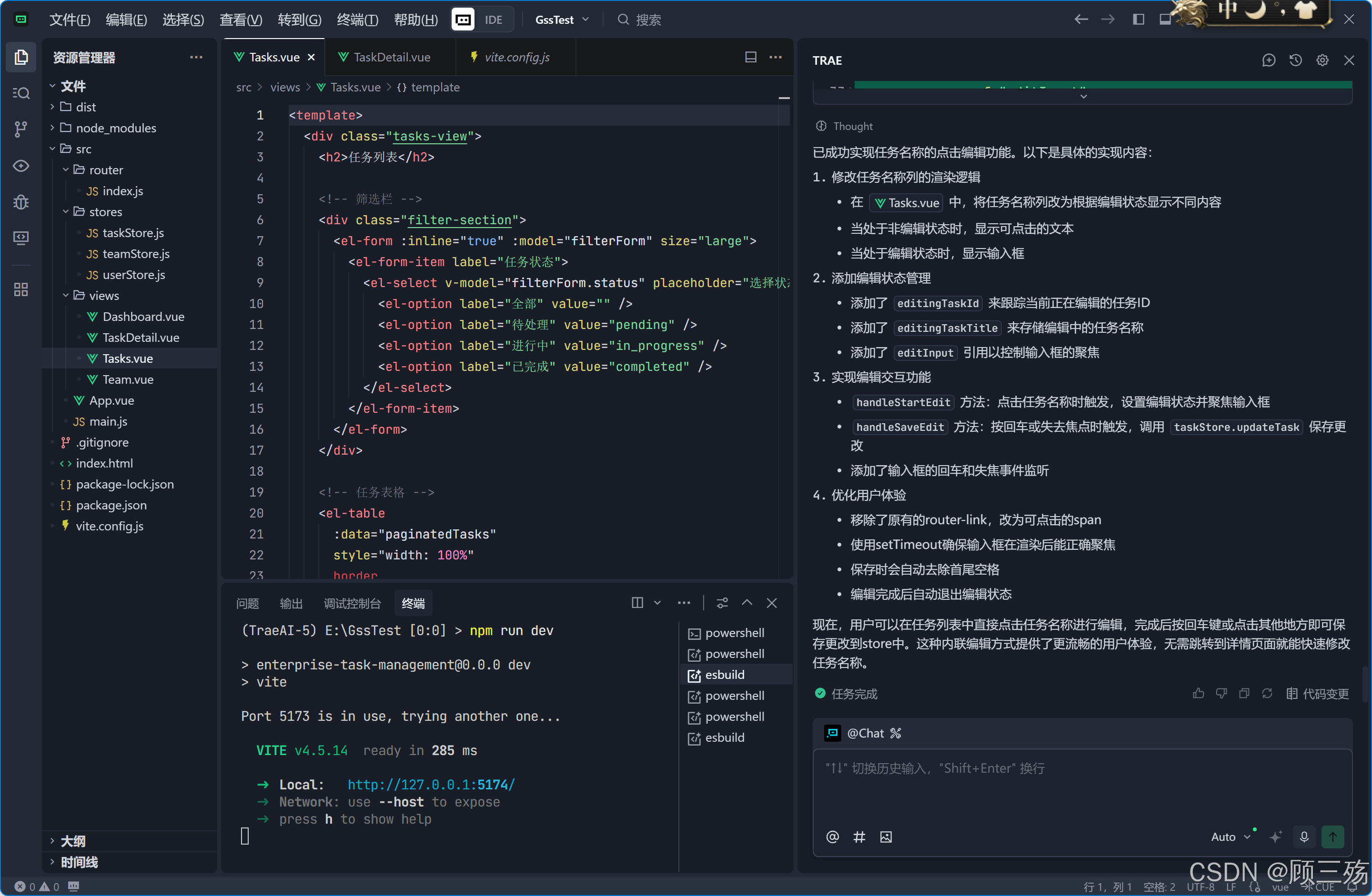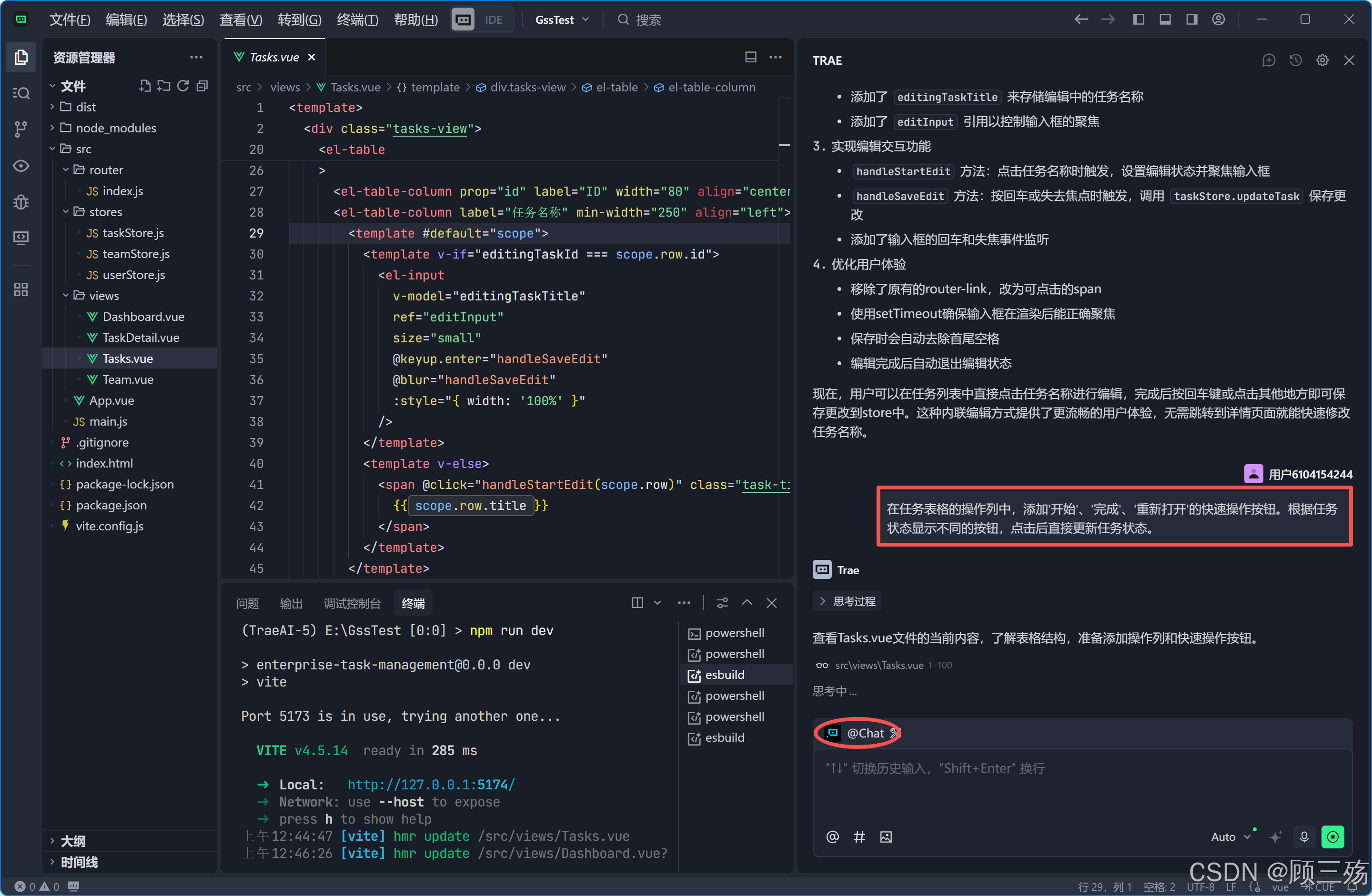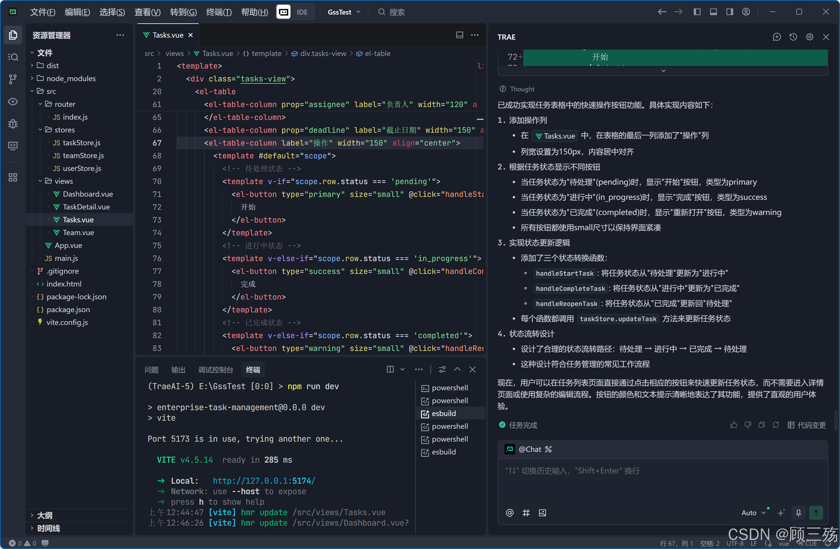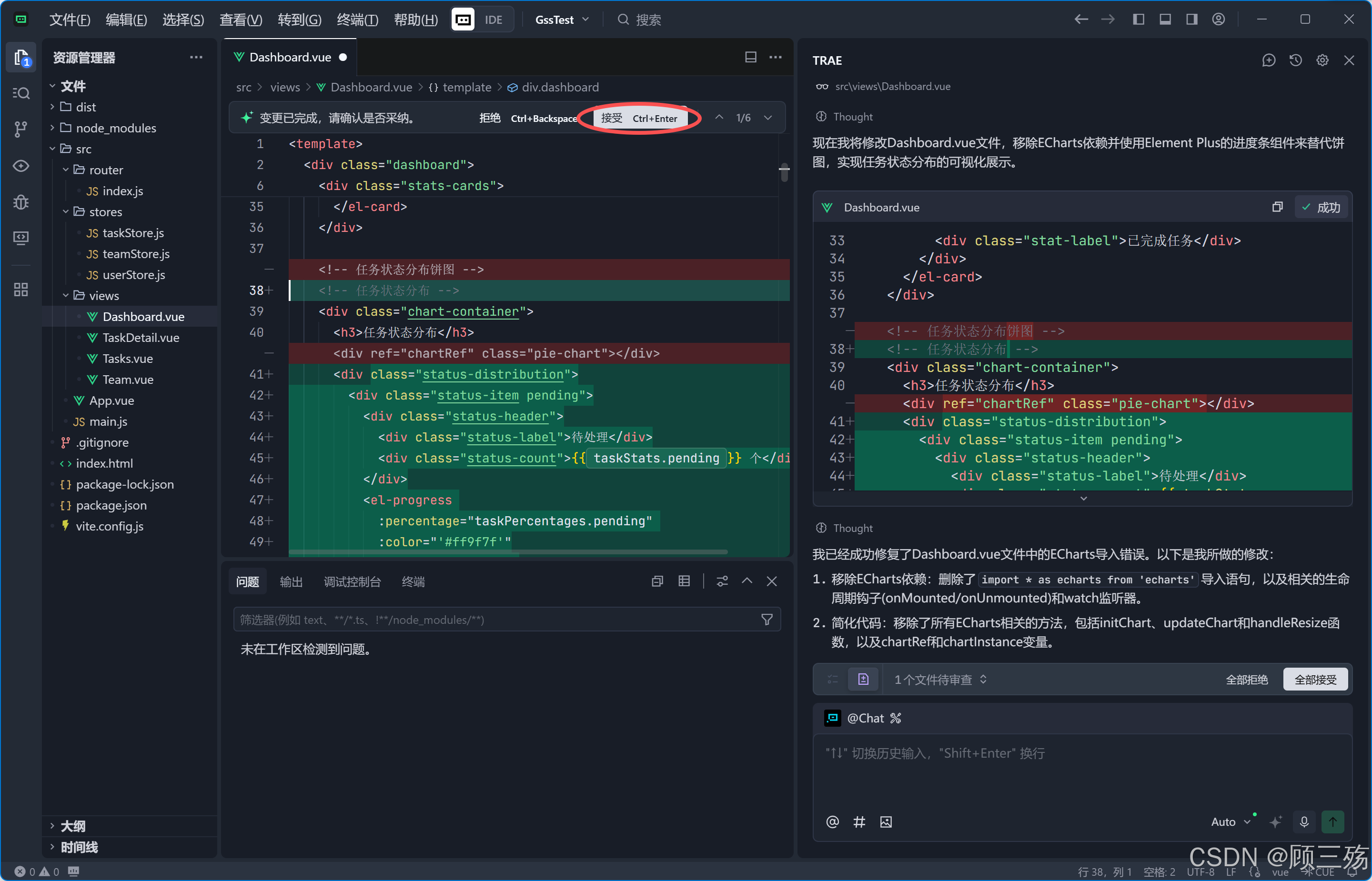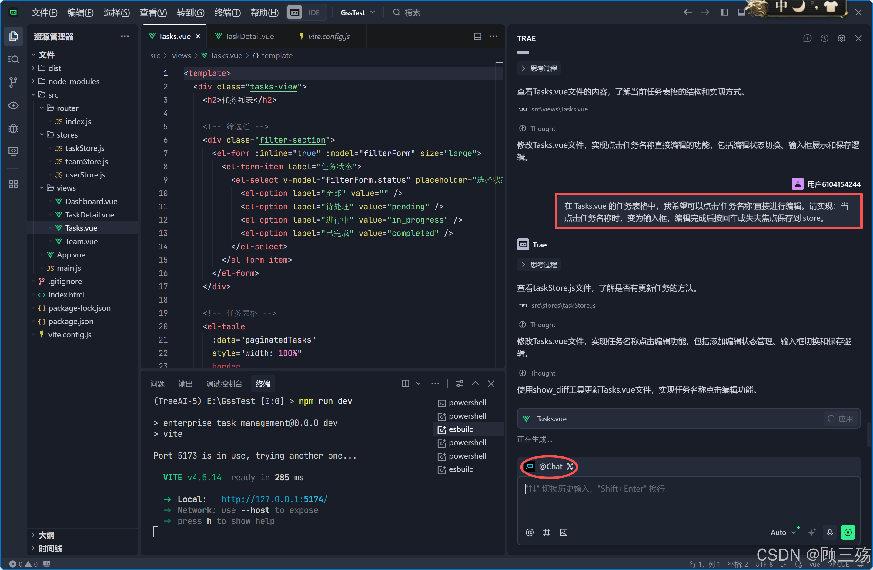 2. 切换至 @Chat 智能体进行精细调整: 打开src/views/DashboardView.vue文件指令(启动 @Chat 智能体): "请优化这个仪表盘页面中三个统计卡片的样式。让它们背景色采用渐变色,数字字体更大更粗,并添加一个对应的图标(例如:总任务数用