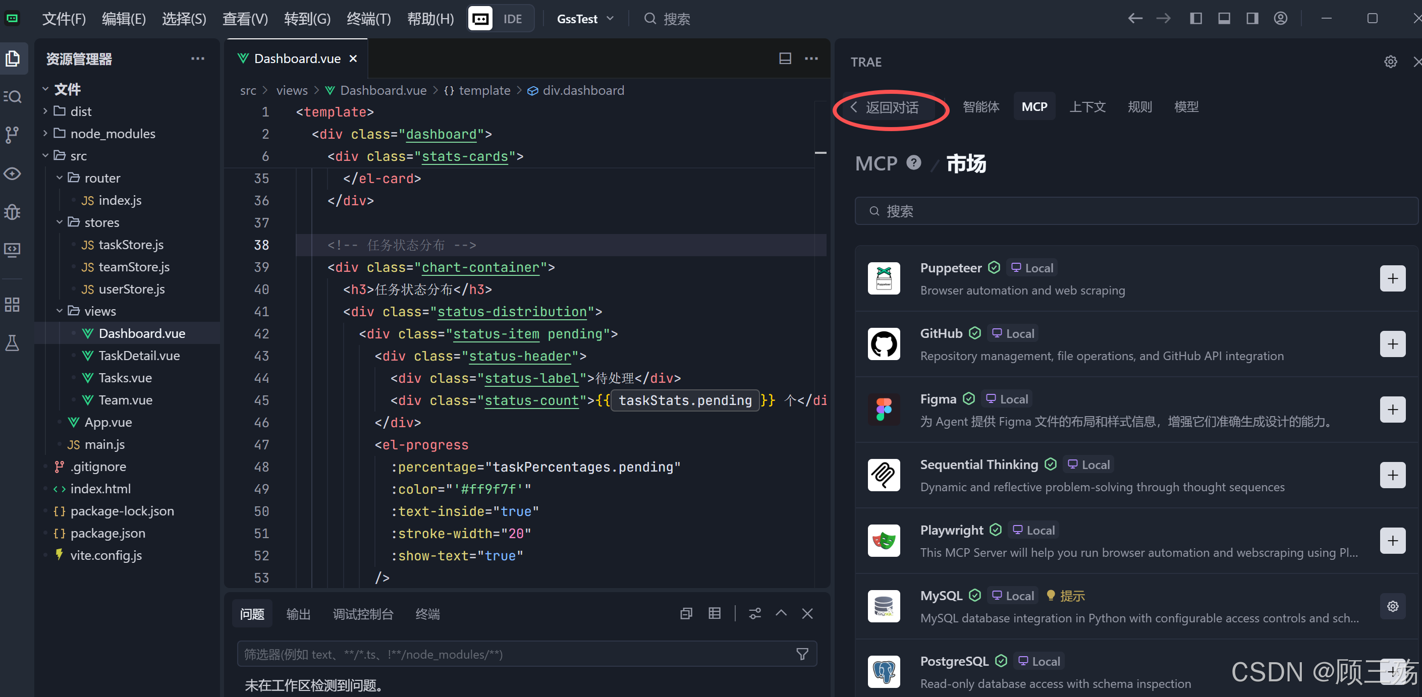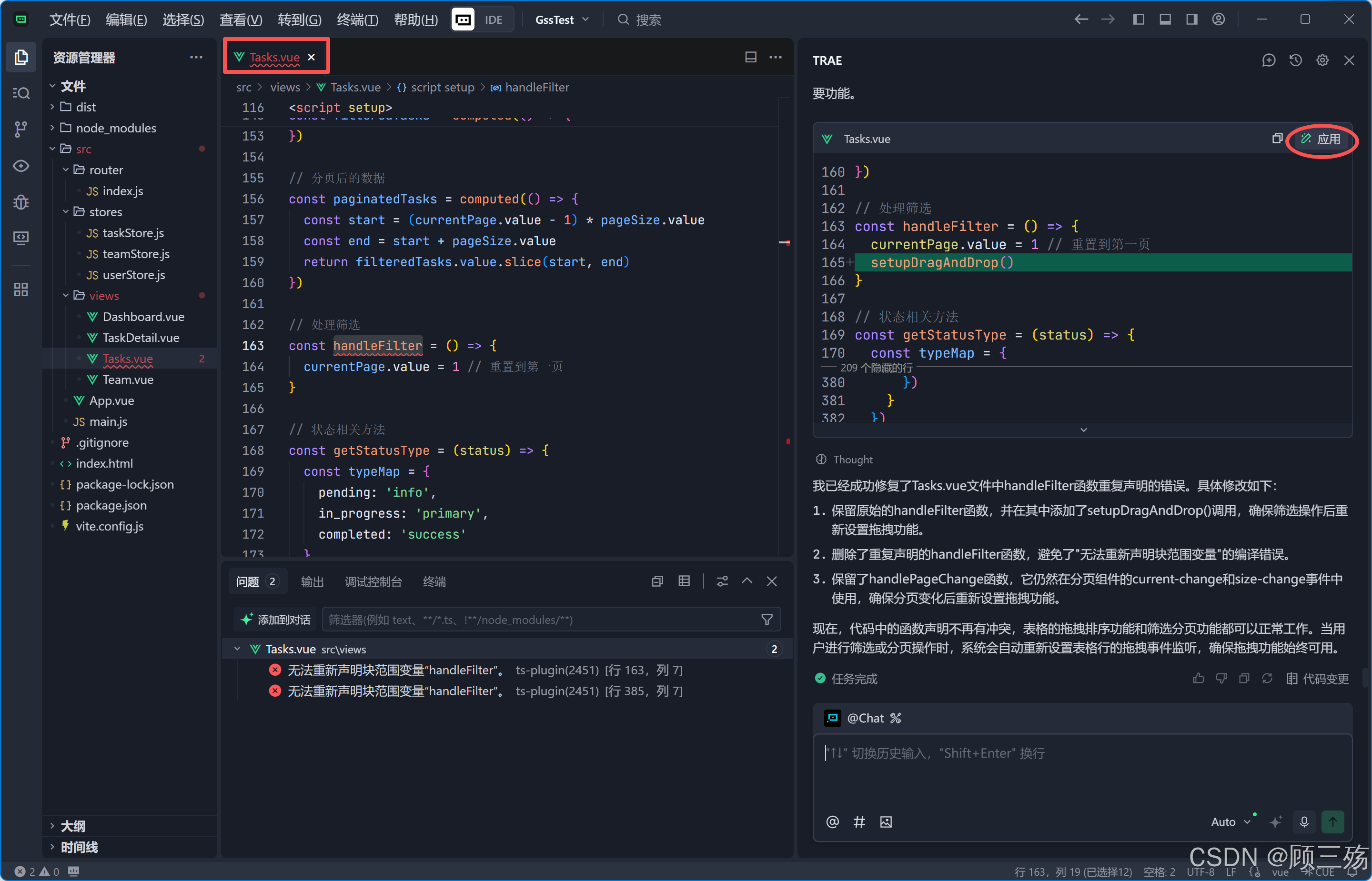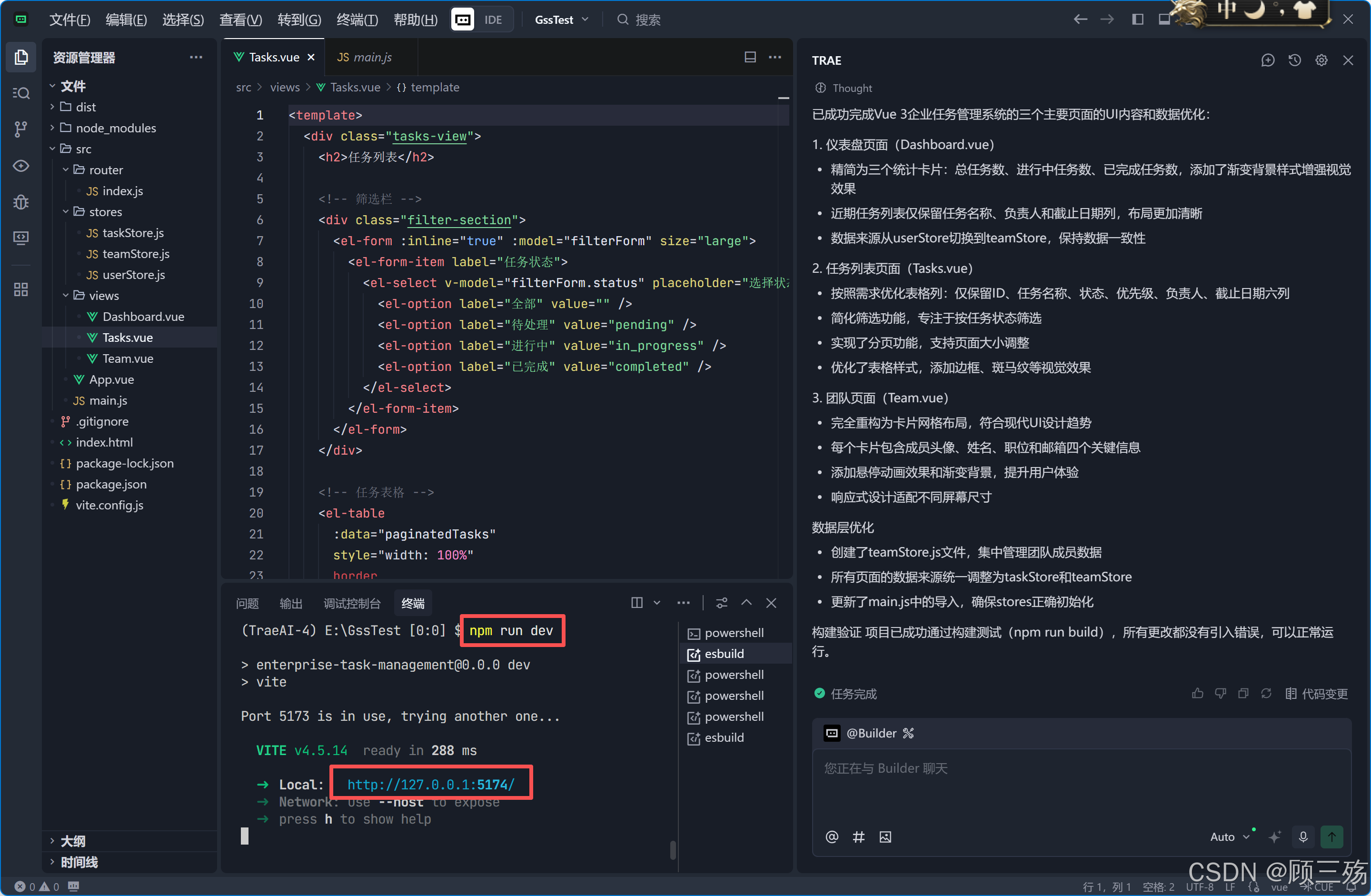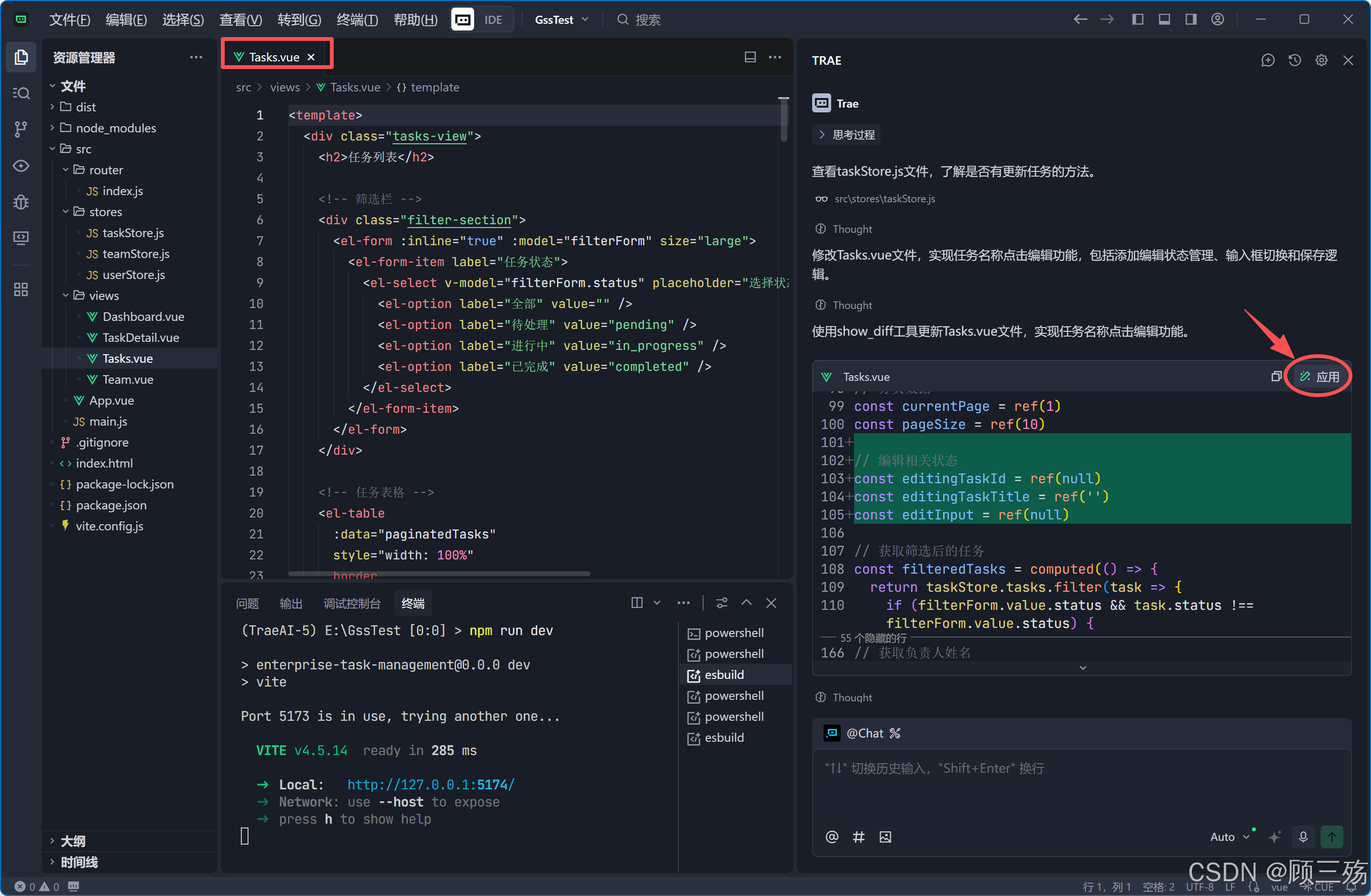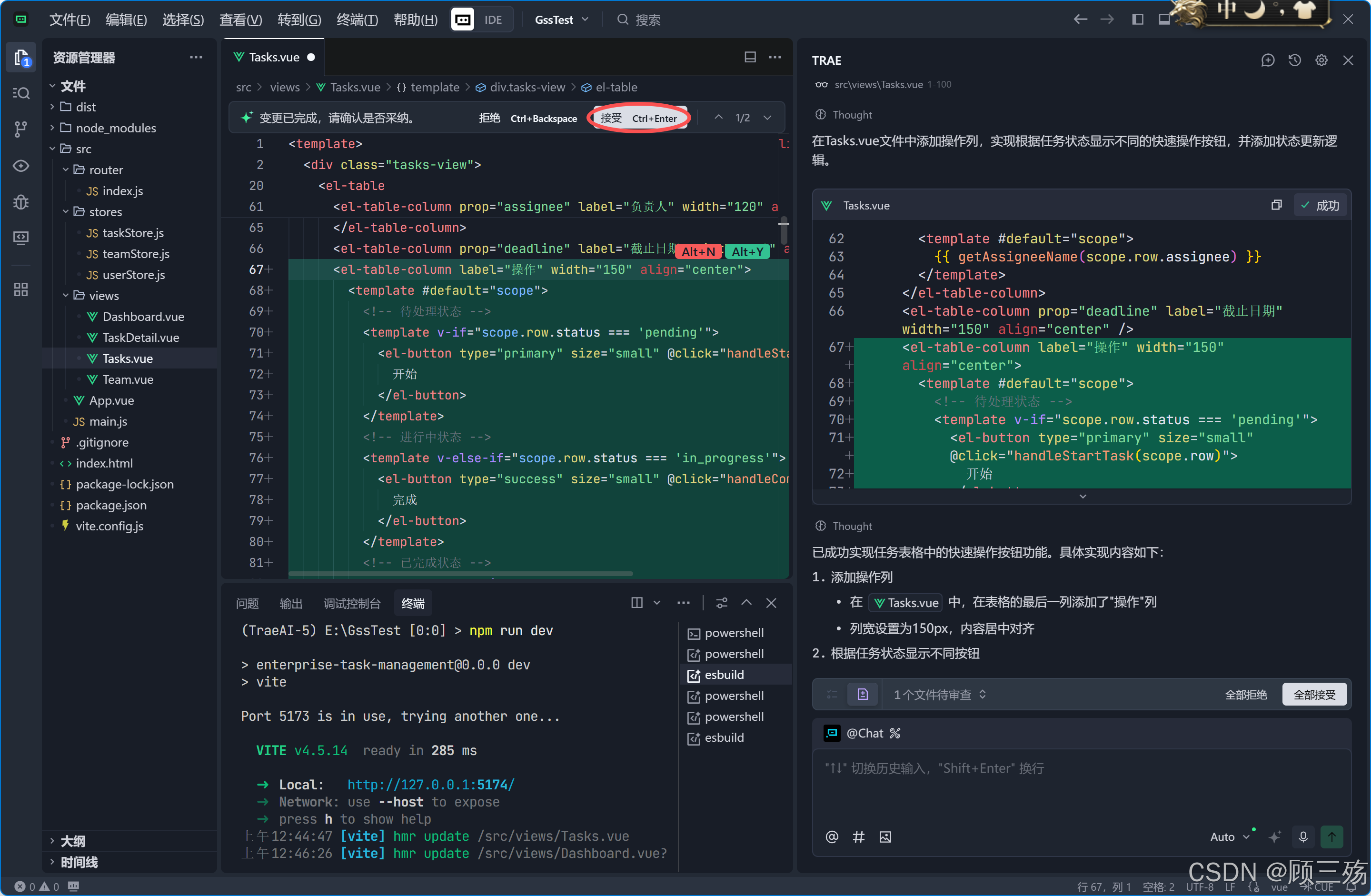 2. 切换至 @Chat 智能体进行精细调整: 打开src/views/DashboardView.vue文件指令(启动 @Chat 智能体): "请优化这个仪表盘页面中三个统计卡片的样式。让它们背景色采用渐变色,数字字体更大更粗,并添加一个对应的图标(例如:总任务数用