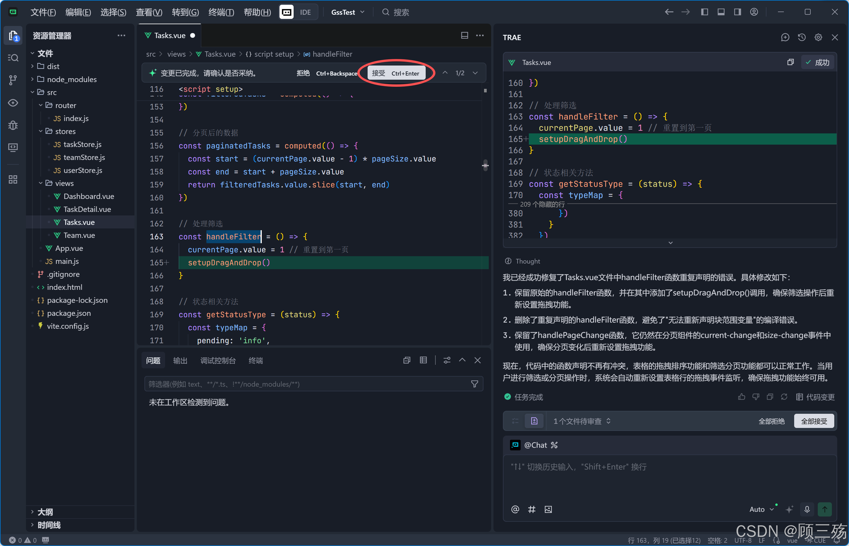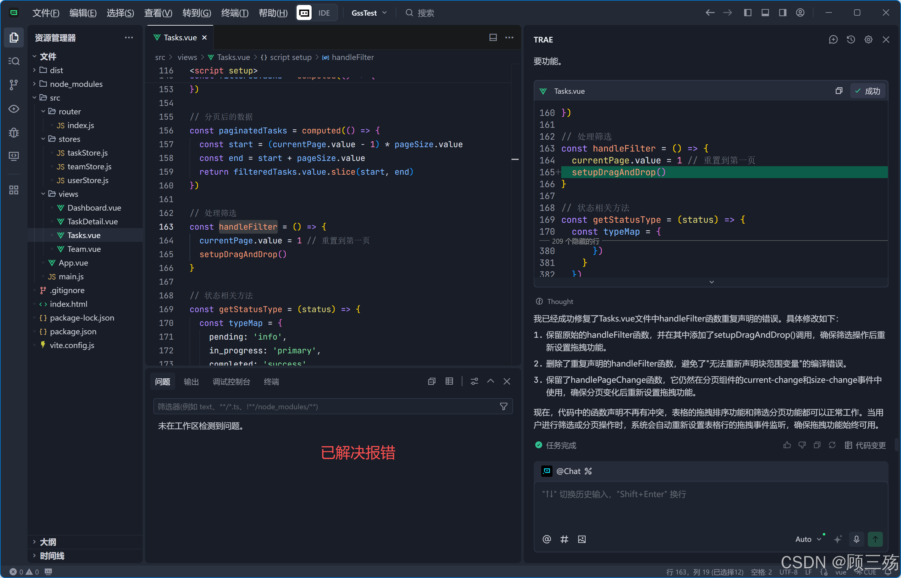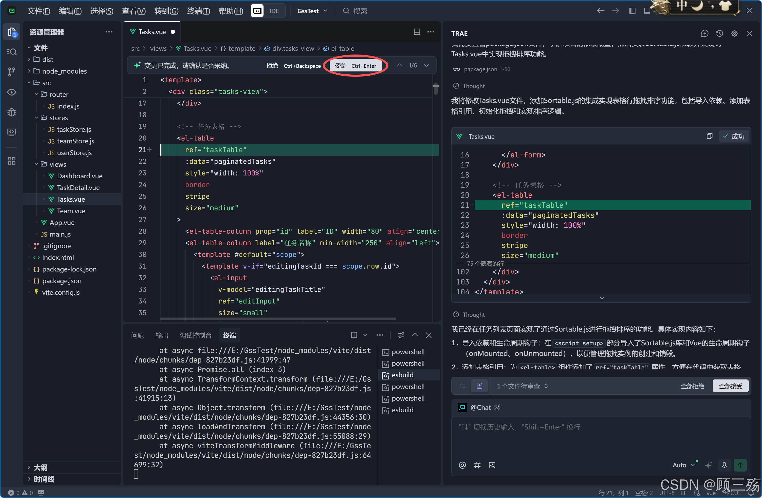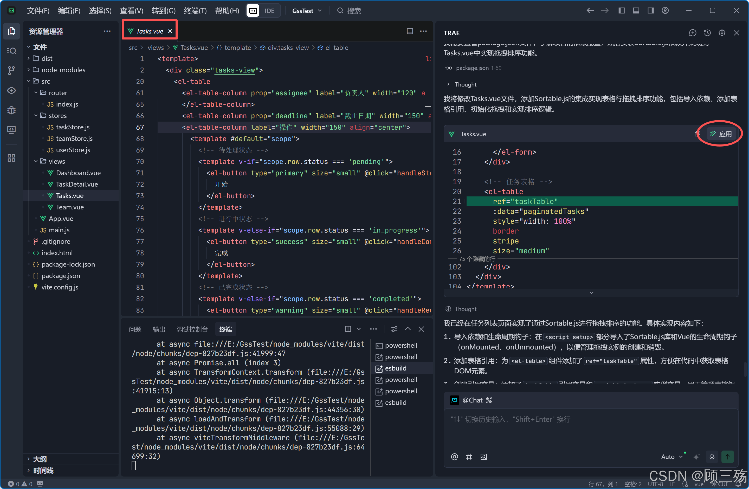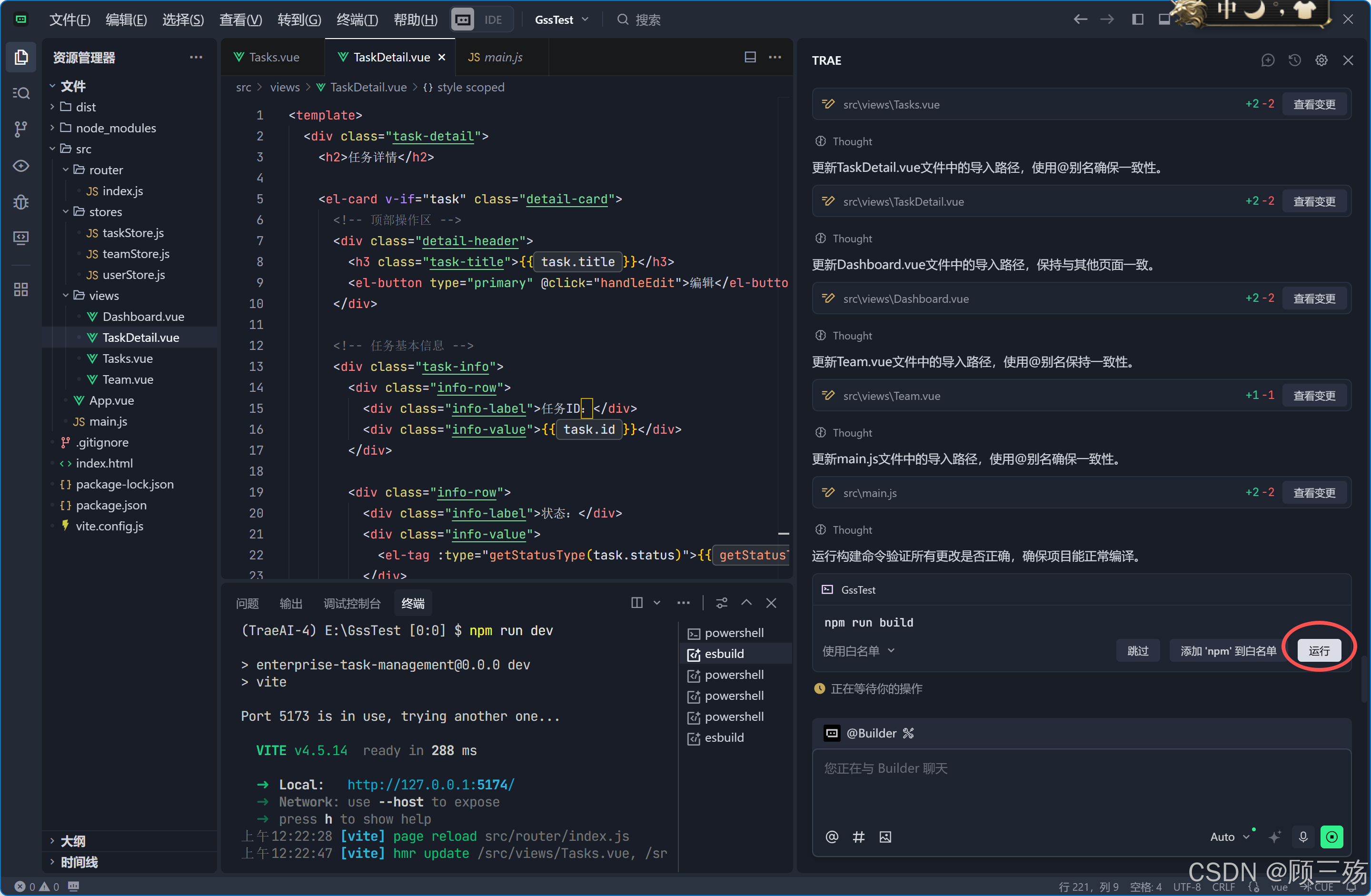 2. 切换至 @Chat 智能体进行精细调整: 打开src/views/DashboardView.vue文件指令(启动 @Chat 智能体): "请优化这个仪表盘页面中三个统计卡片的样式。让它们背景色采用渐变色,数字字体更大更粗,并添加一个对应的图标(例如:总任务数用