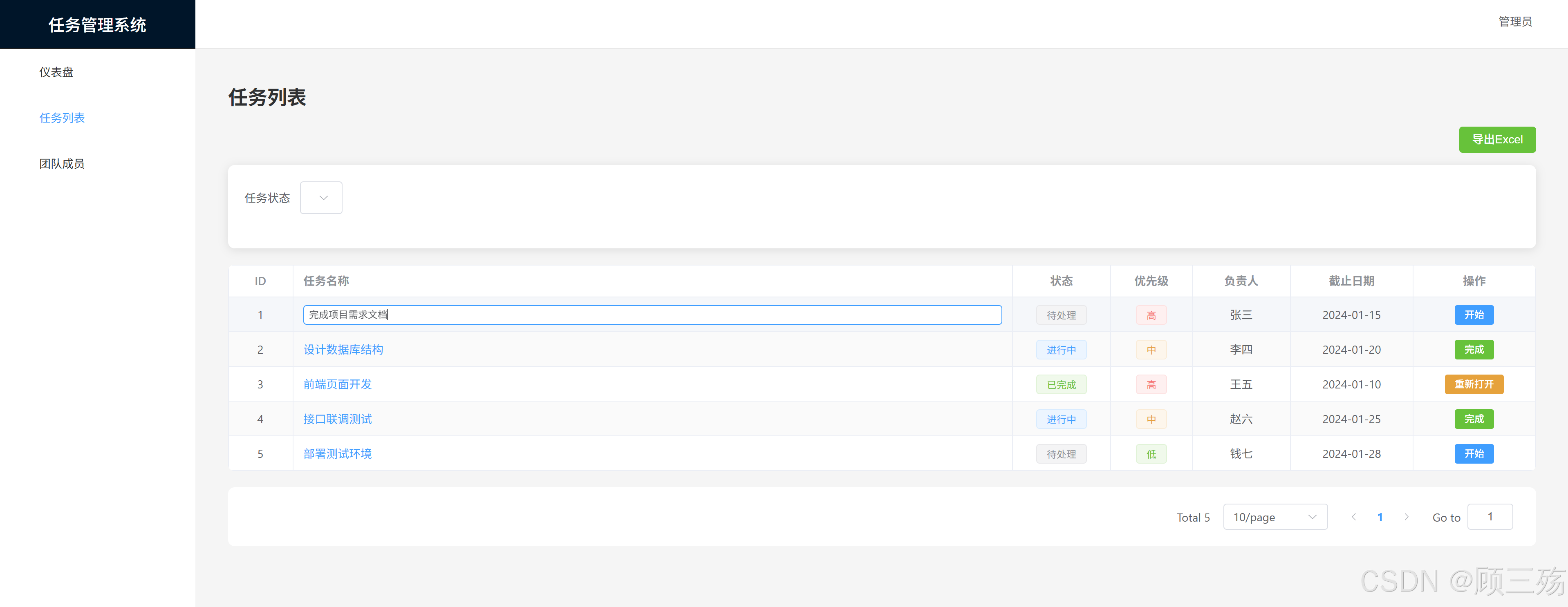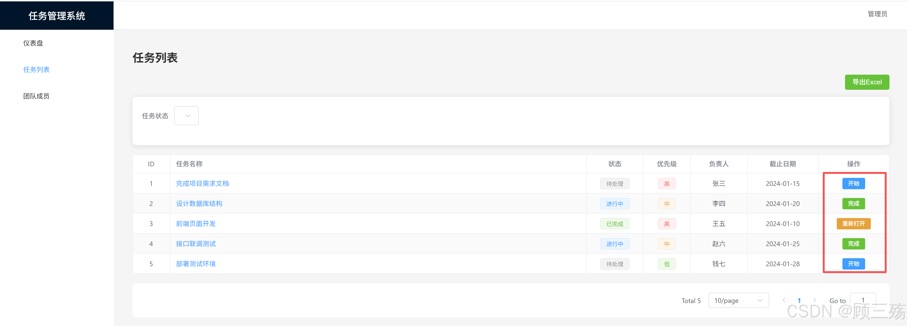 "在任务表格的操作列中,添加'开始'、'完成'、'重新打开'的快速操作按钮。根据任务状态显示不同的按钮,点击后直接更新任务状态。