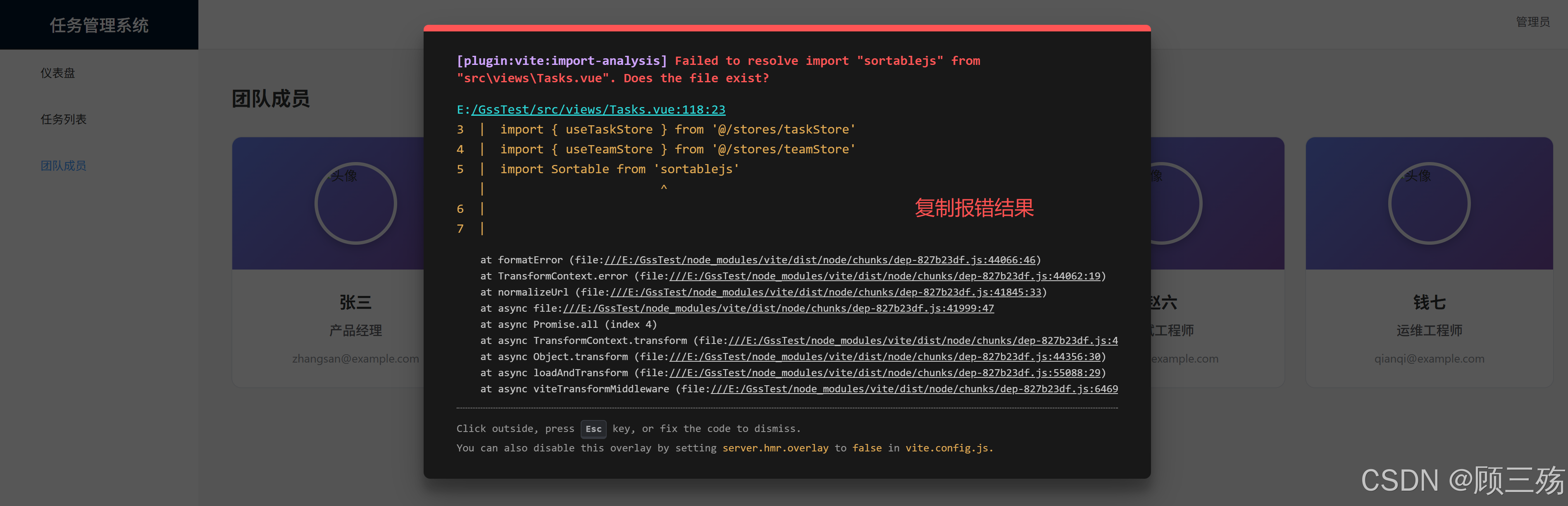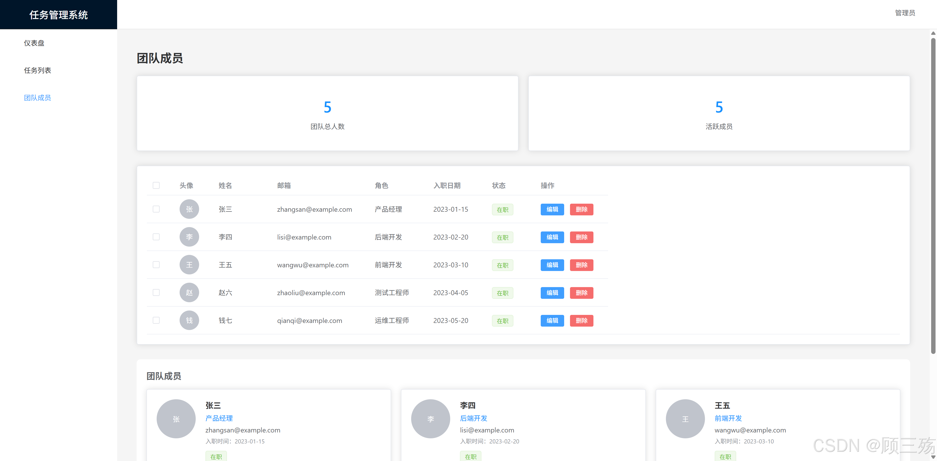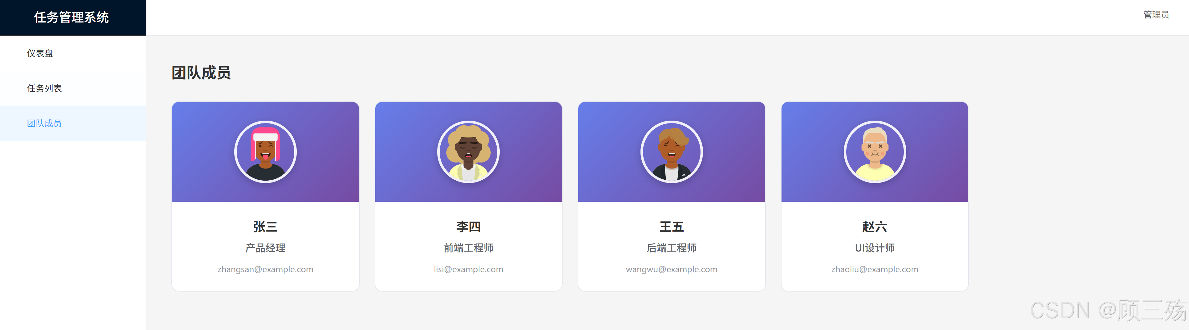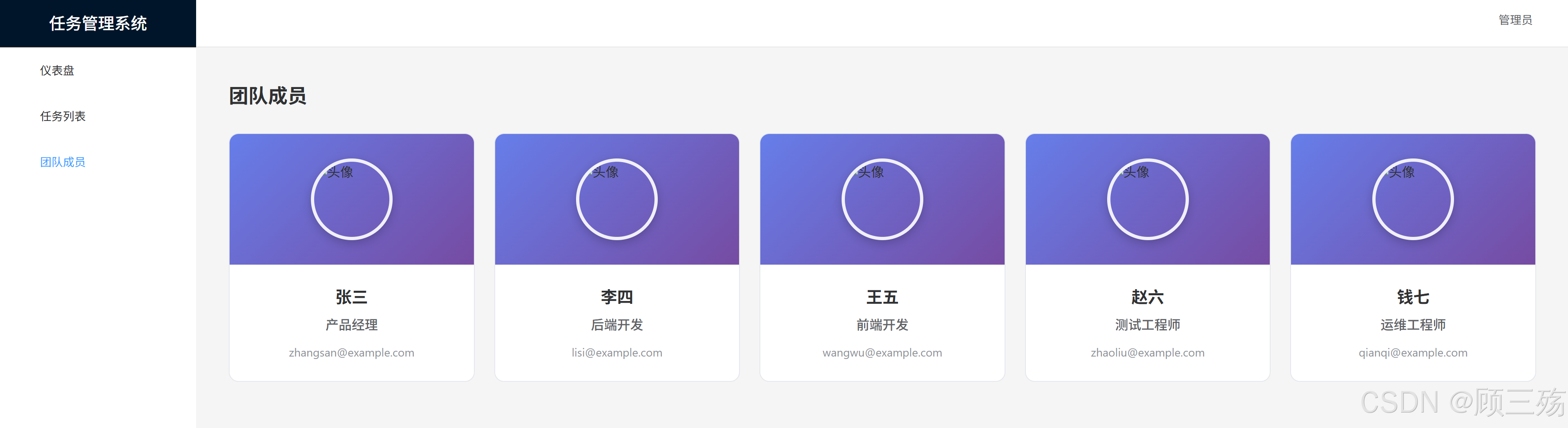 /team):**使用卡片网格展示团队成员,每个卡片包含成员头像、姓名、职位和邮箱。数据层: 请在 Pinia 中创建一个