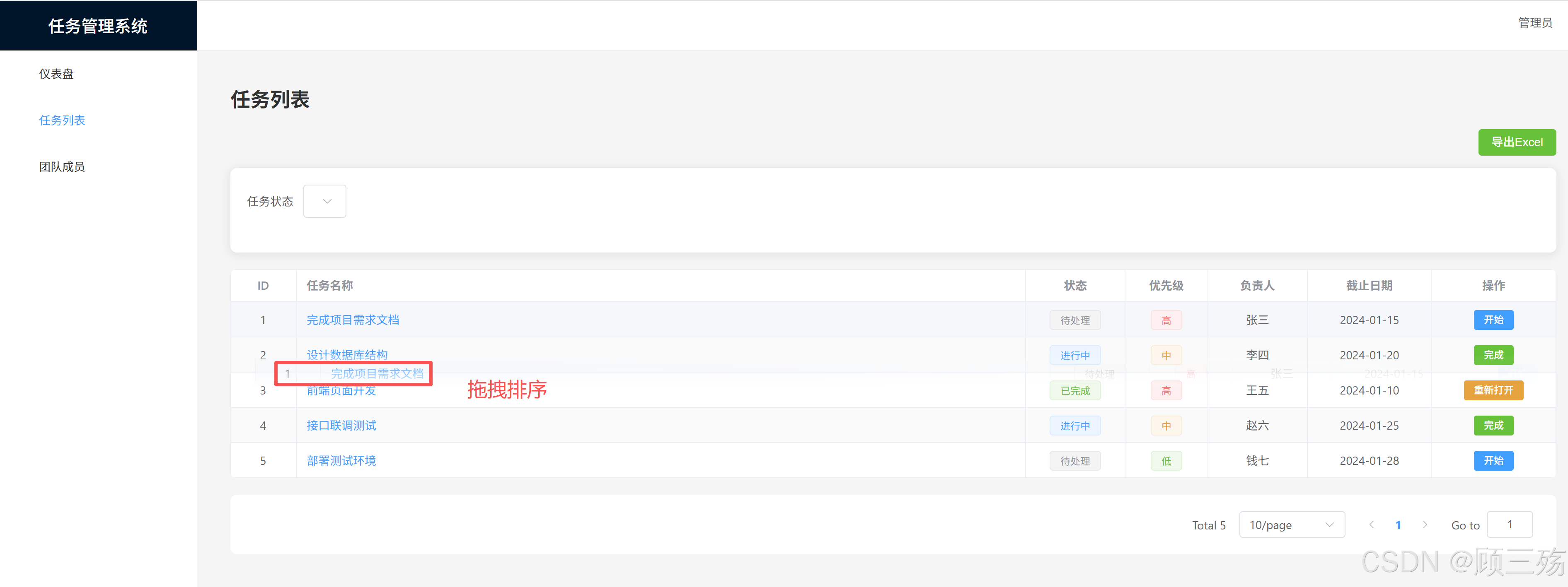 "在任务列表页面,我希望可以通过拖拽来调整任务的显示顺序。请使用 Sortable.js 实现表格行的拖拽排序功能。"