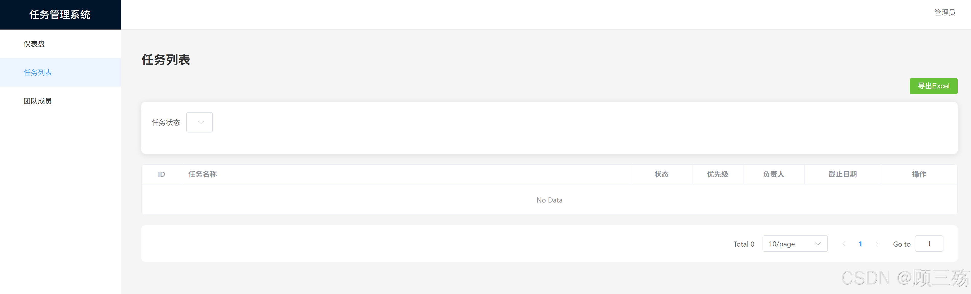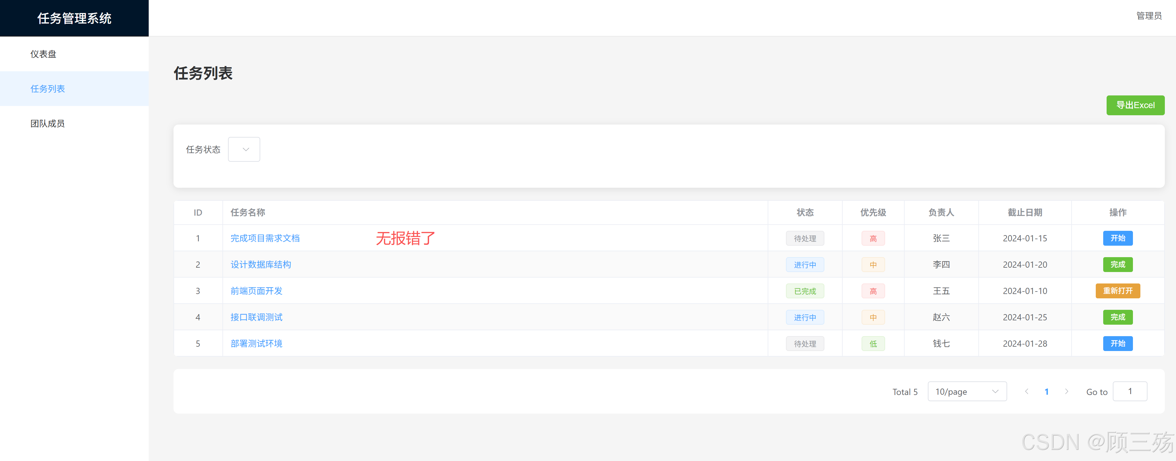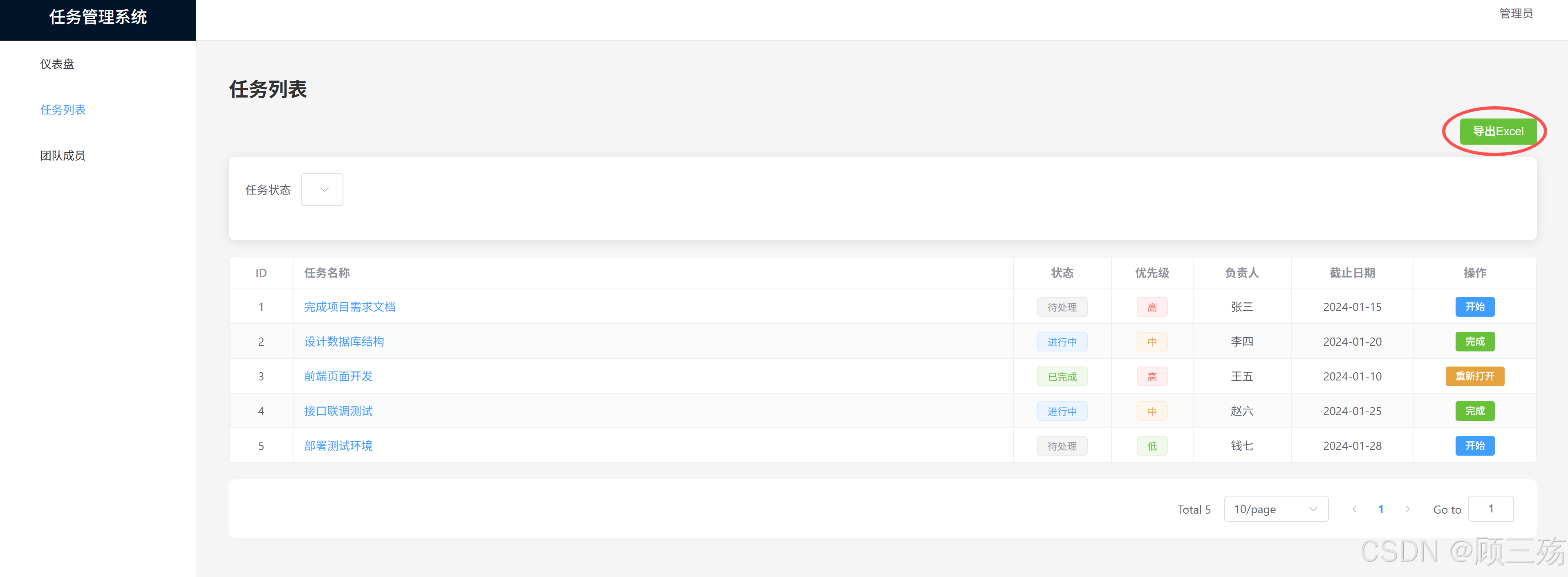 "在任务列表页面顶部添加一个'导出Excel'按钮,点击后可以将当前筛选的任务数据导出为 CSV 格式文件。"