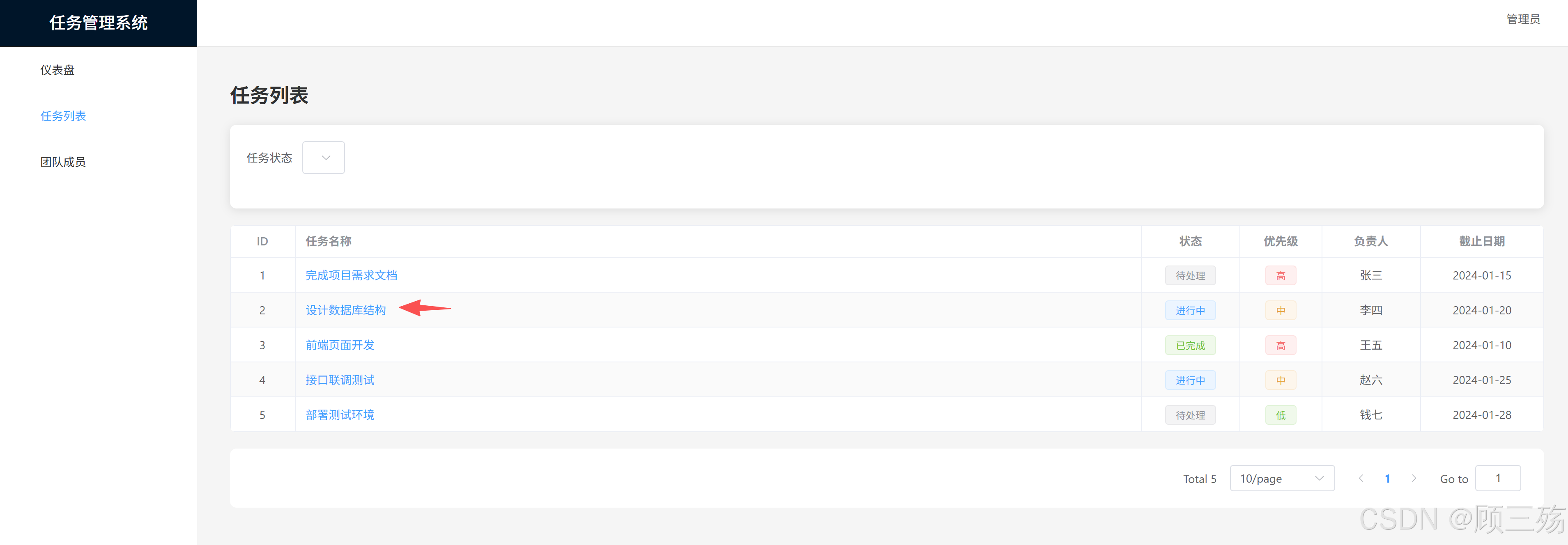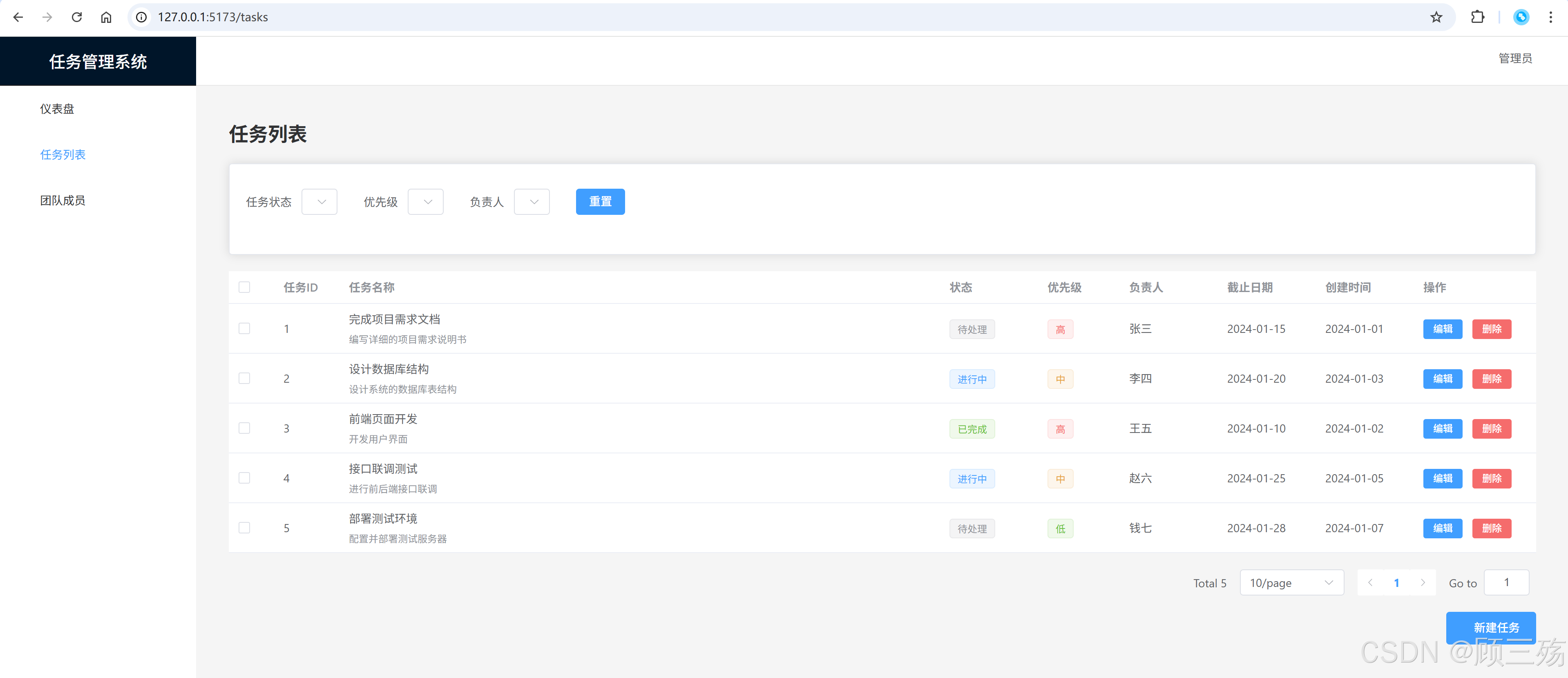 使用 ElTable 展示任务,列包括:ID、任务名称、状态、优先级、负责人、截止日期。