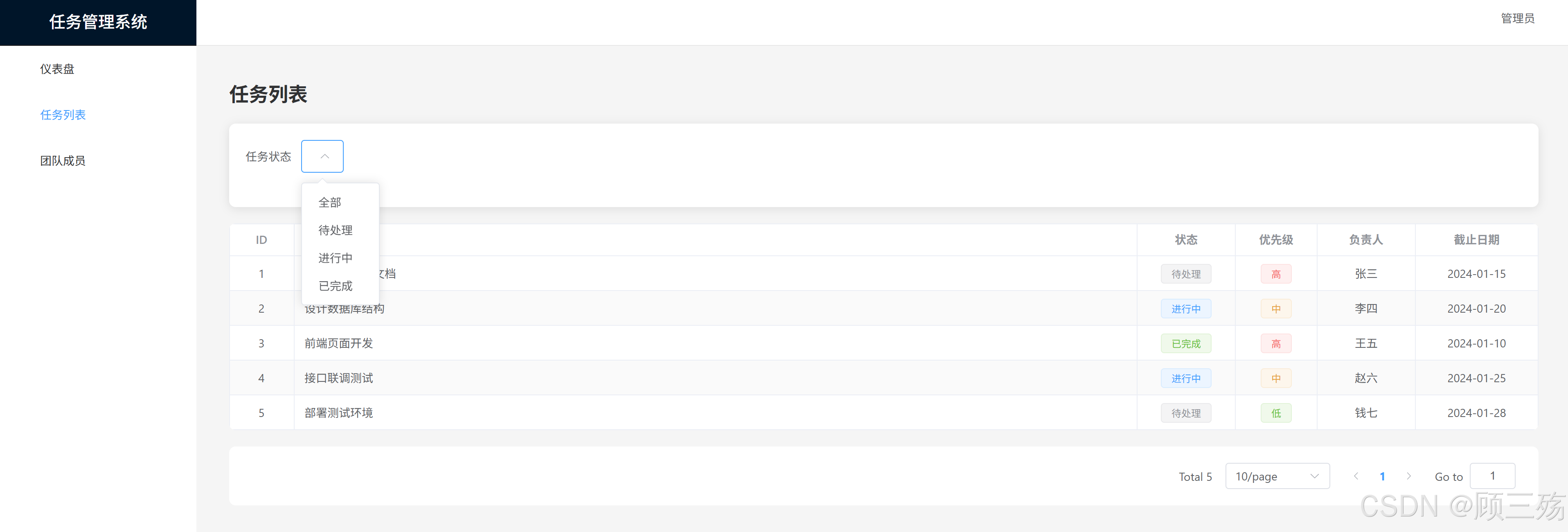顶部提供筛选栏,可以根据任务状态进行筛选。