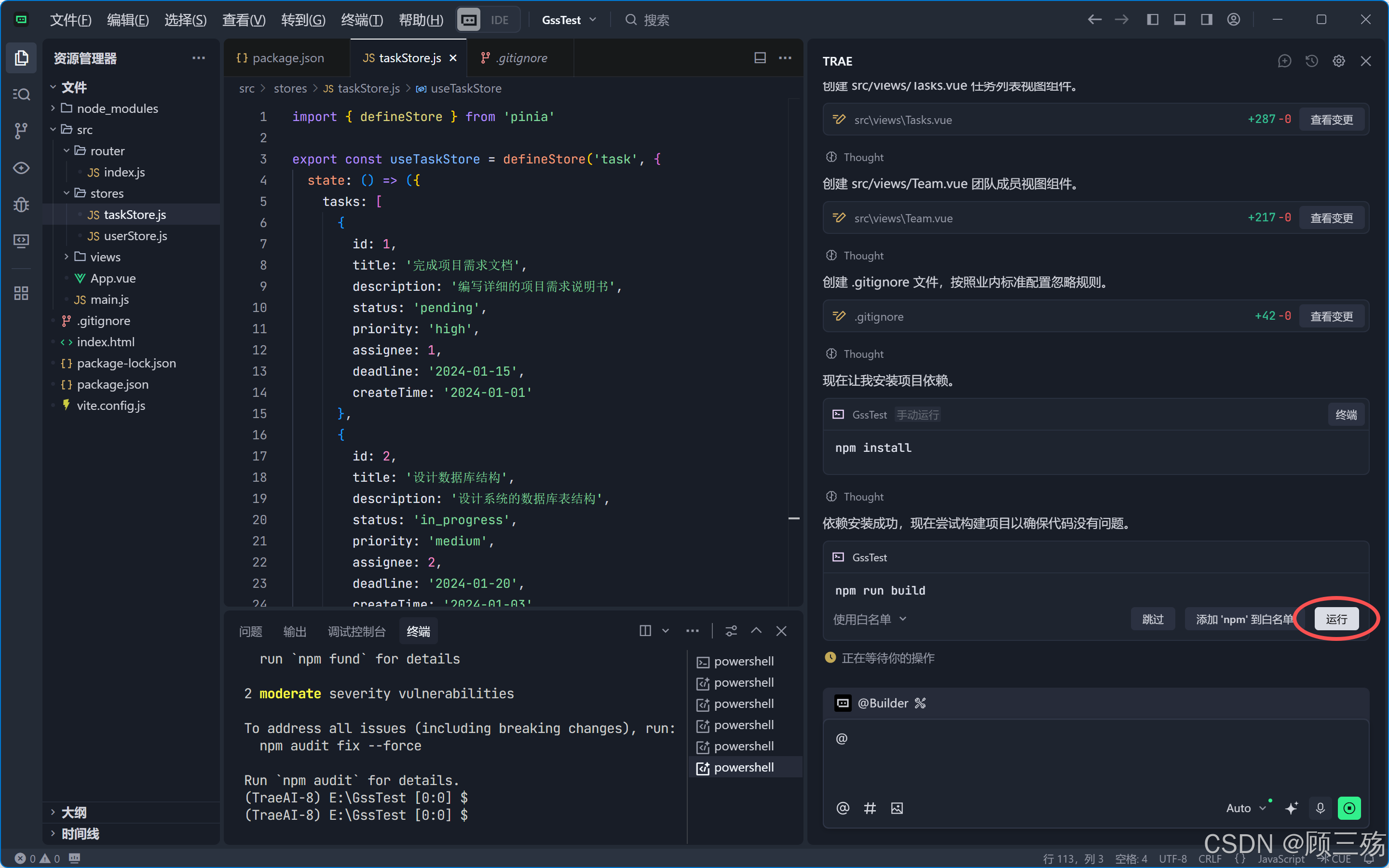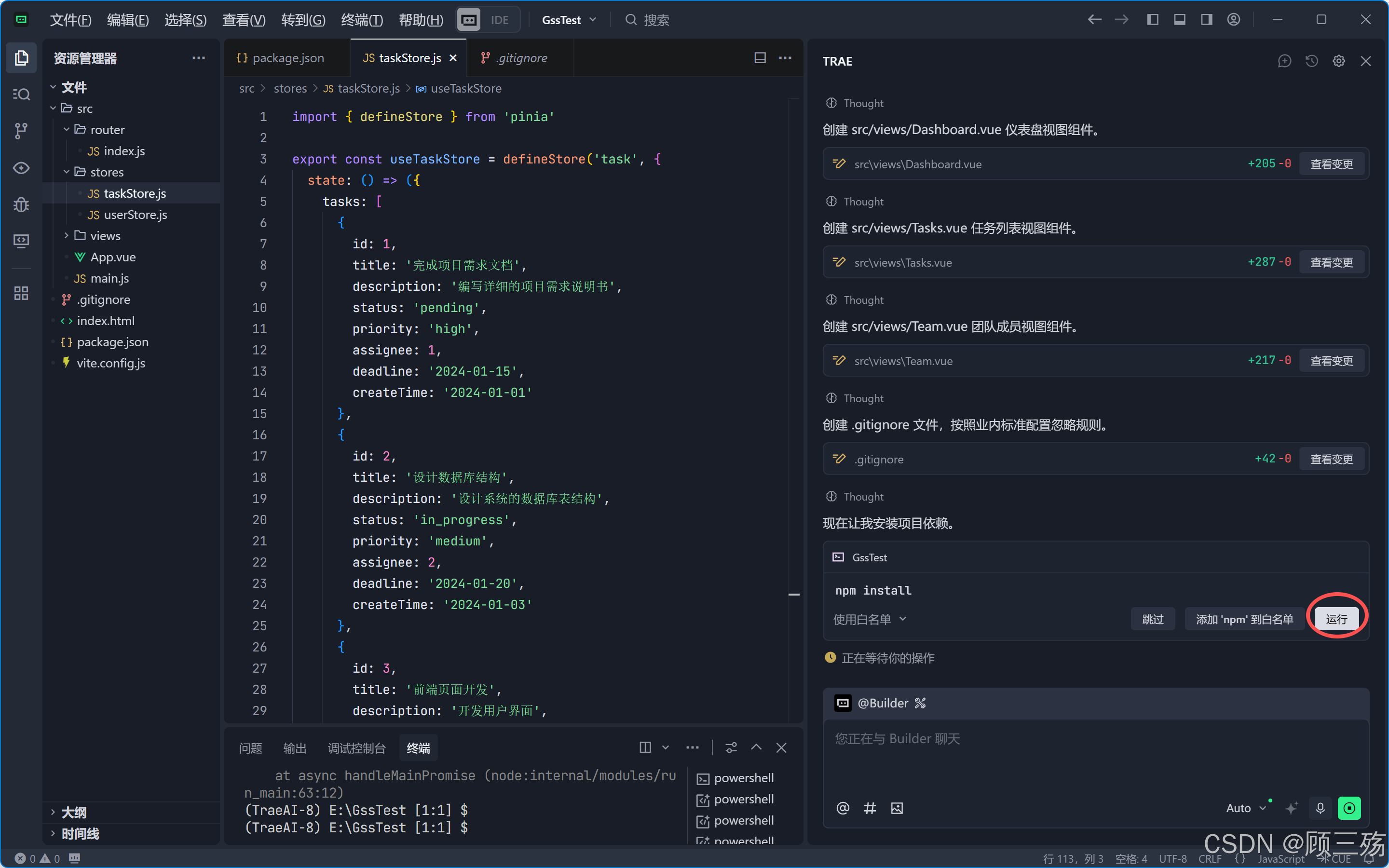 src/stores/taskStore.js:定义tasks状态,并生成模拟的任务数据数组。包含fetchTasks,updateTask等动作。